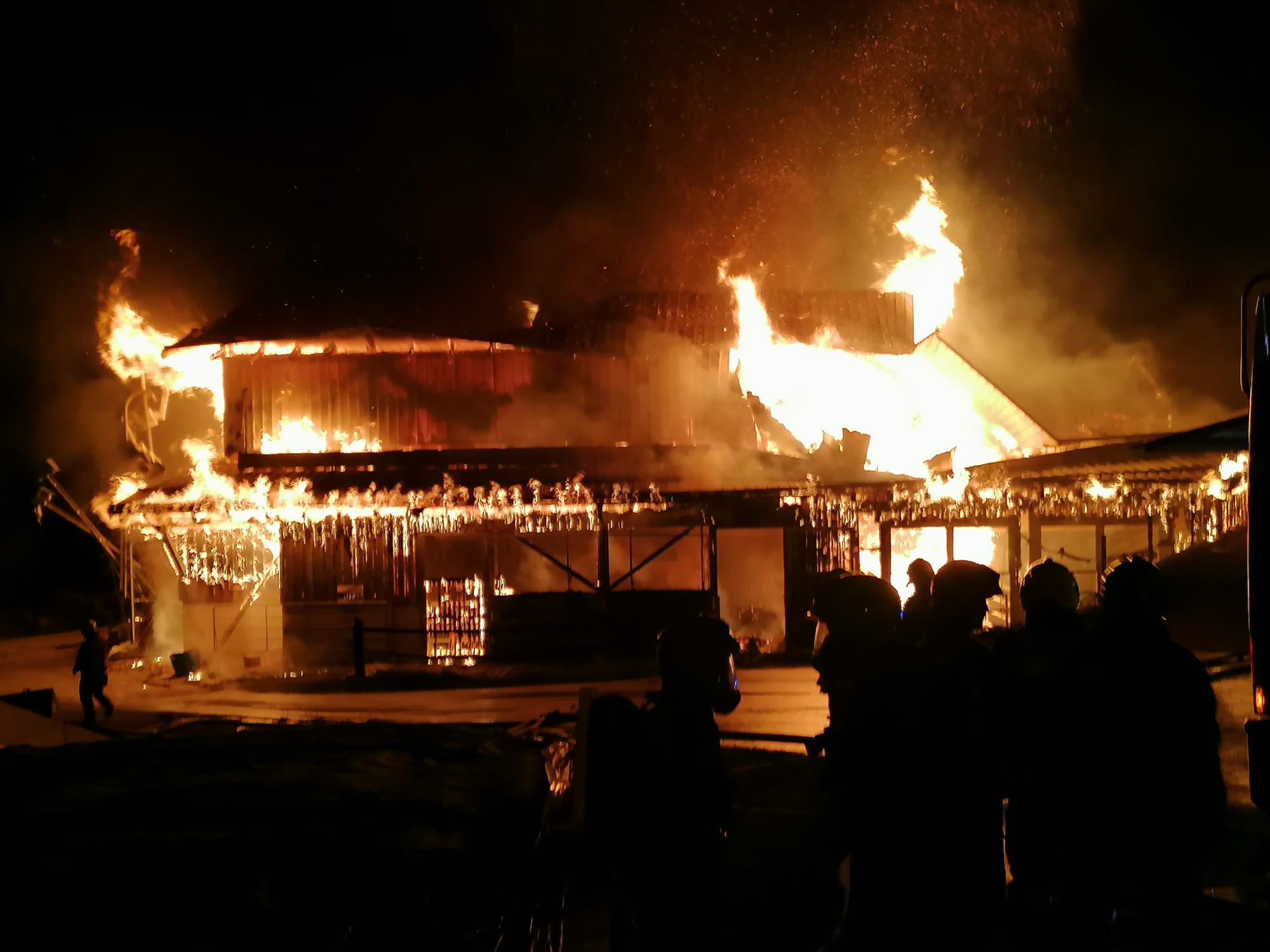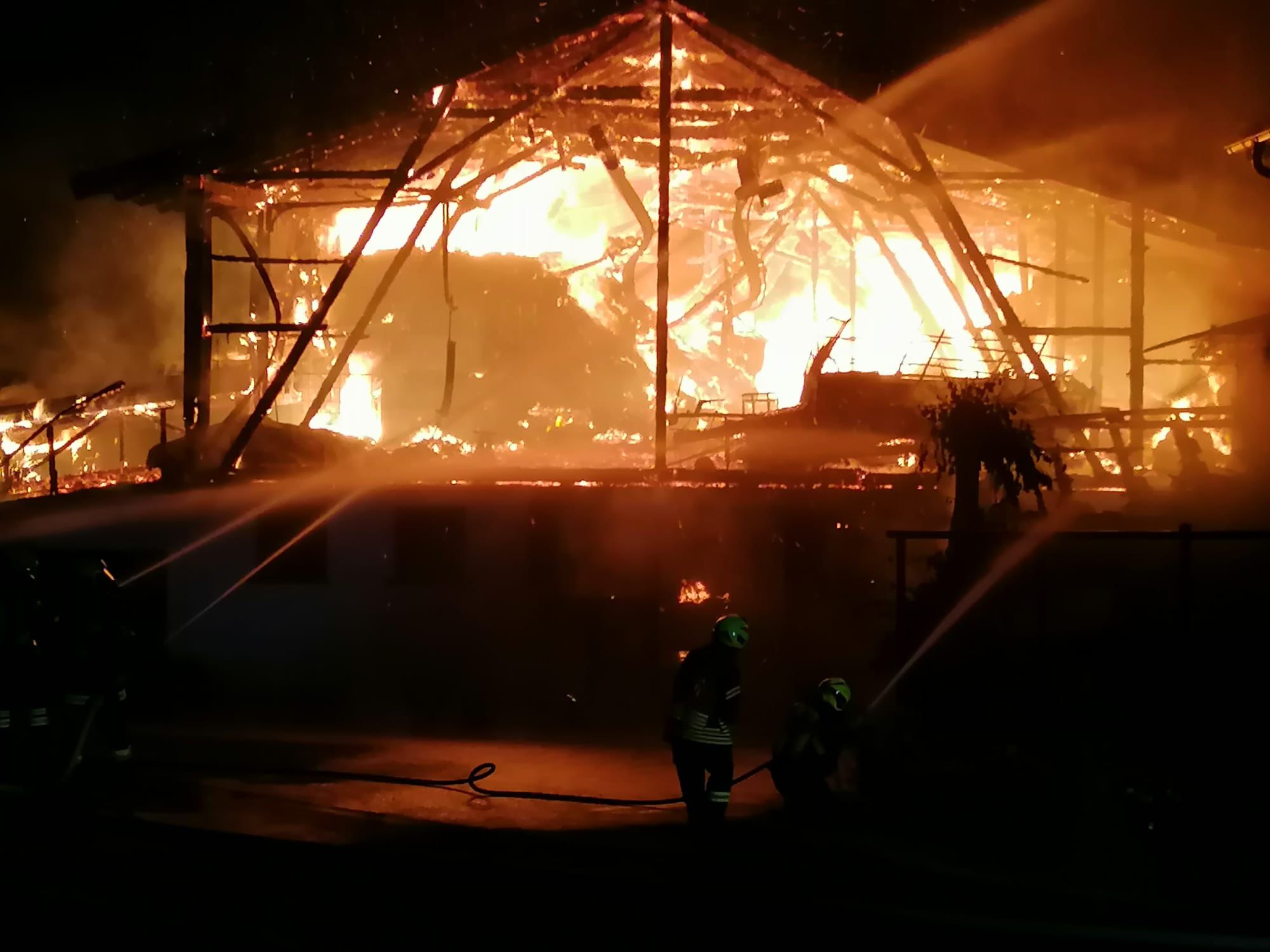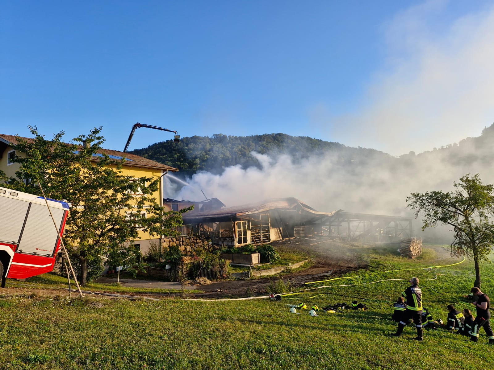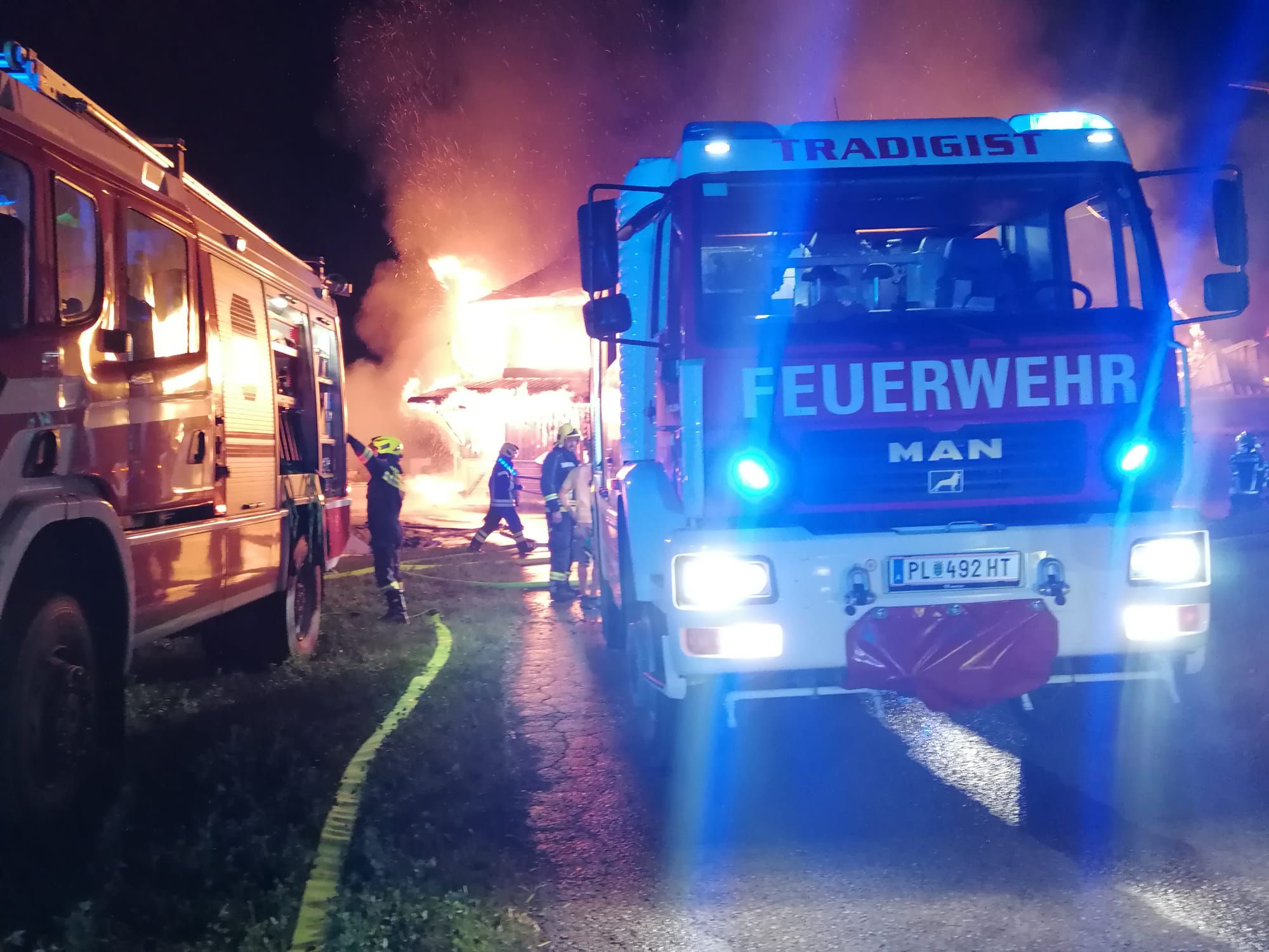 Beim Eintreffen der Einsatzkräfte stand das Stallgebäude eines landwirtschaftlichen Betriebs bereits im Vollbrand. Es galt mit vereinten Kräften das direkt angrenzende Wohnhaus zu schützen.