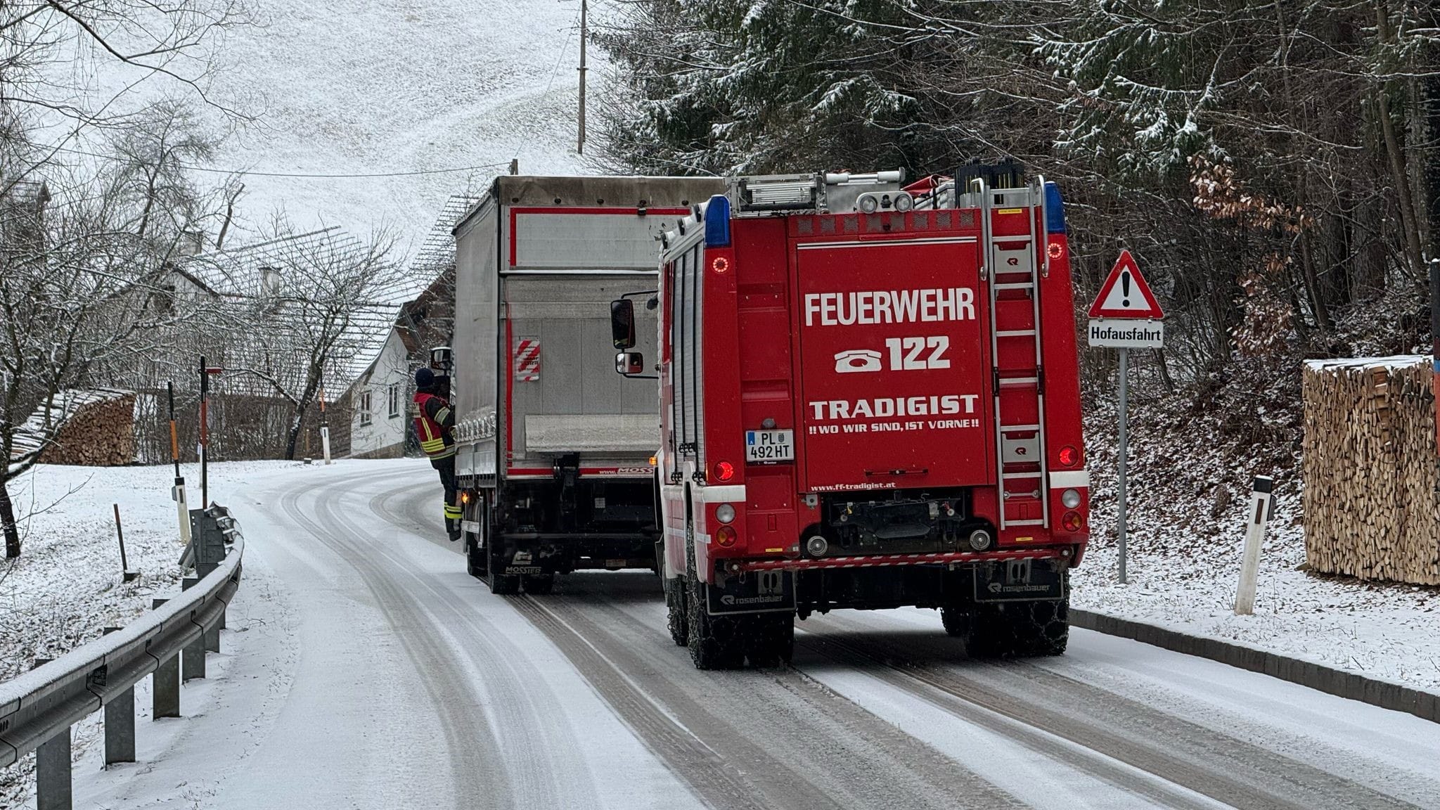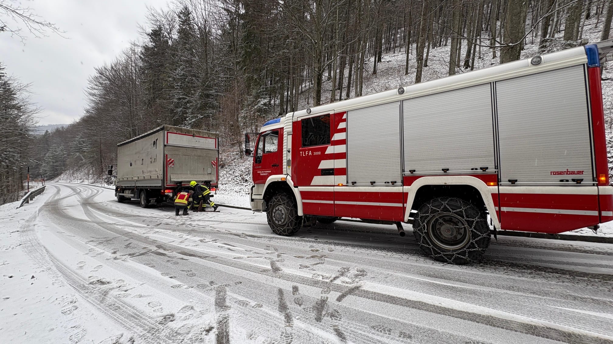 Ein LKW geriet bergab ins Rutschen. Der Fahrer setzte seine Fahrt zur Sicherheit ohne Unterstützung nicht weiter fort und alarmierte die Feuerwehr.