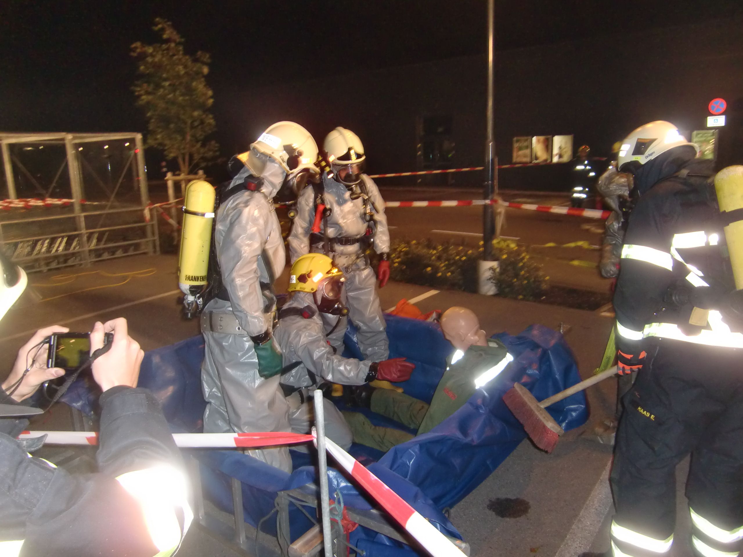 Übungsannahme war ein Verkehrsunfall bei dem 2 LKW´s beladen mit Gefahrenstoffen zusammengestossen waren.