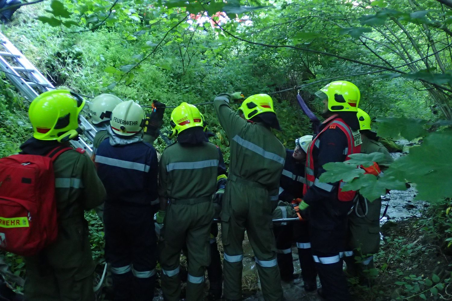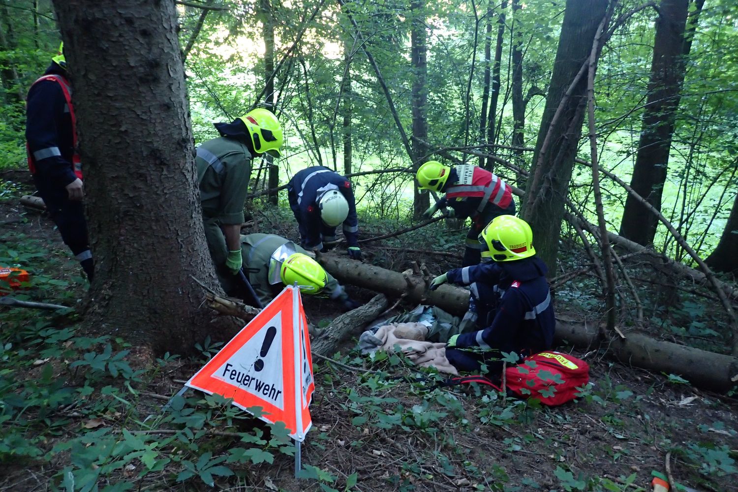 Die FF Tradigist wurde gerufen, da eine Passantin Hilferufe aus einem Waldstück vernommen hatte. Die angerückten Feuerwehrmitglieder bildeten eine Suchkette durch das Waldstück. Die verletzte Person, die unter einem Baumstamm eingeklemmt war, konnte schnell gefunden werden. Mittels Hebekissen wurde sie befreit und in Sicherheit gebracht.