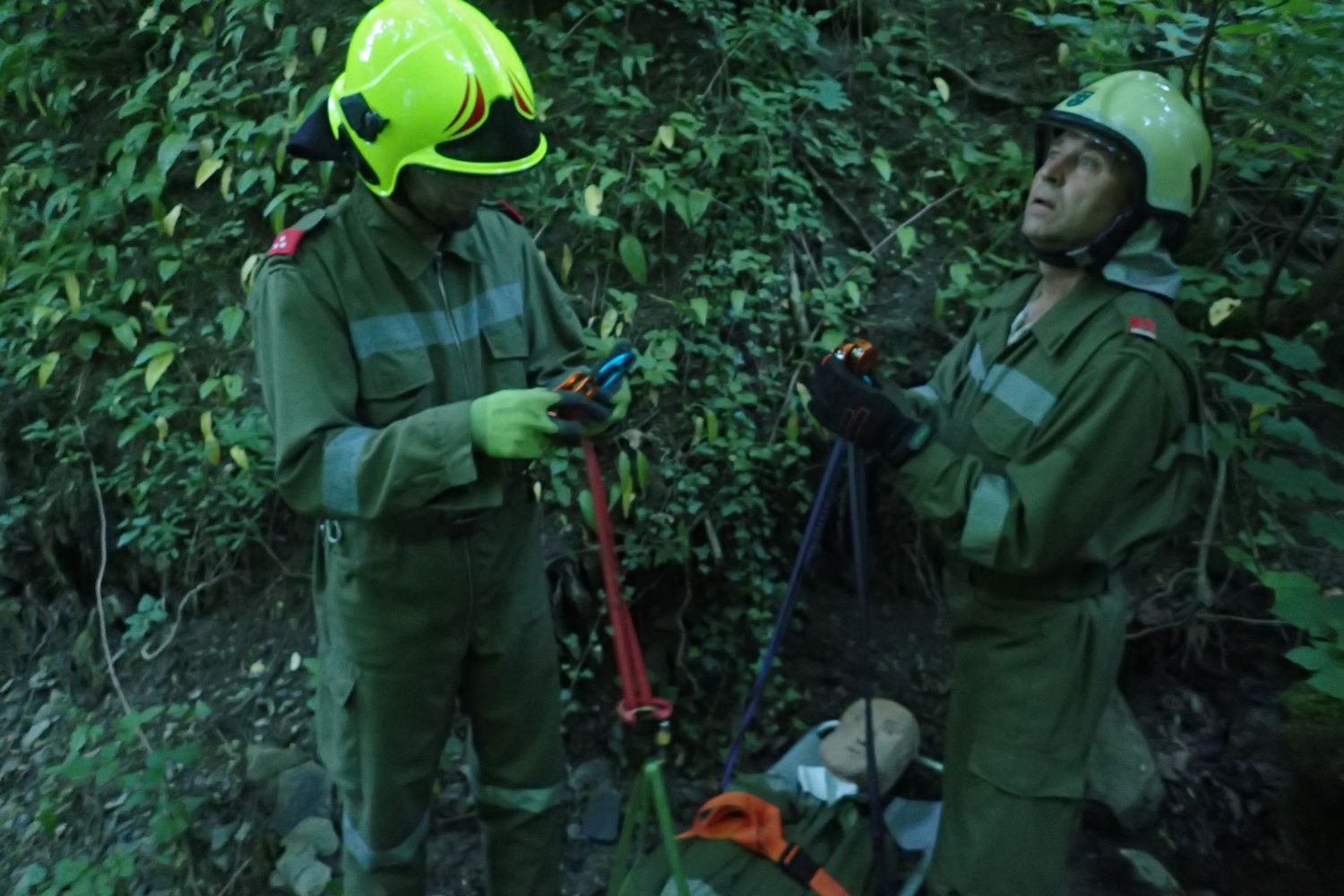 Eine Person war in eine Grube gestürzt, und lag dort bewusstlos neben einem kleinen Bach. Es wurde ein Seilzug über der Grube angebracht, um die verletzte Person schnell und trotzdem so schonend wie möglich in Sicherheit bringen zu können.