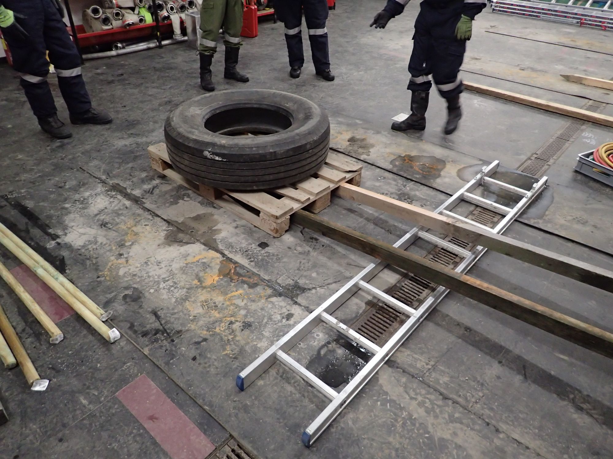 Eine Holzpalette, auf der ein LKW Reifen liegt, muss ohne Kraftaufwand durch die Mannschaft über den durch die Steckleiter simulierten Bach transportiert werden.