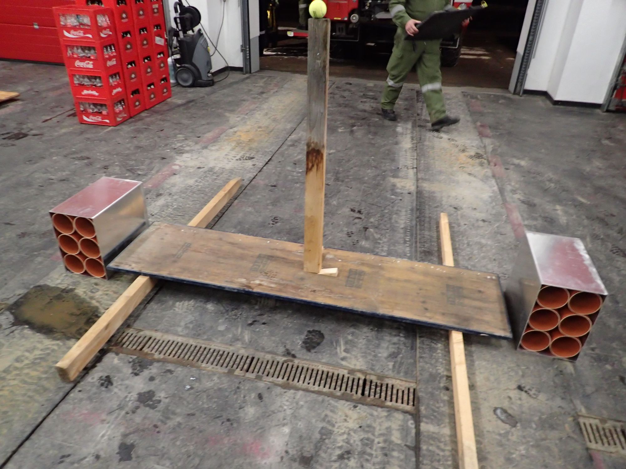 Die Schaltafel muss wiederum ohne Kraftaufwand und Stabilisierung durch die Mannschaft auf 30 cm angehoben und möglichst erschütterungsarm untergebaut werden, sodass der Tennisball oben liegen bleibt. Als weiteres Hinderniss durfte der Bediener der Hebekissensteuerung keinen Sichtkontakt zum Tennisball haben. Er musste sich auf die Anweisungen seiner Kameraden verlassen und mit besonderer Vorsicht und Gefühl vorgehen.