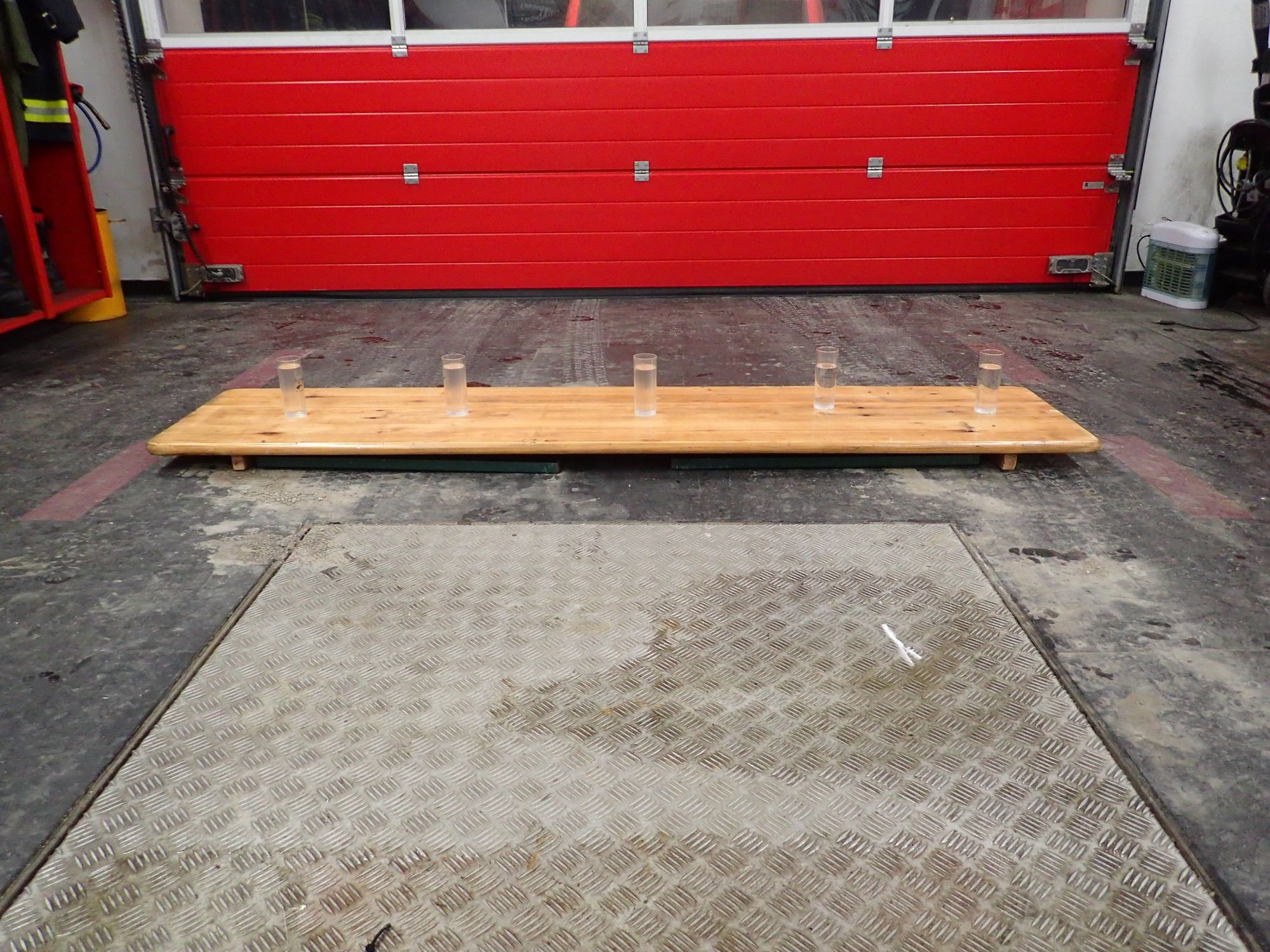 Ein Heurigentisch, auf welchem 5 volle Wassergläser stehen, muss ohne menschlichem Kraftaufwand soweit hochgehoben werden, dass die Füße des Tischs problemlos ausgeklappt werden können ohne Wasser zu verschütten.