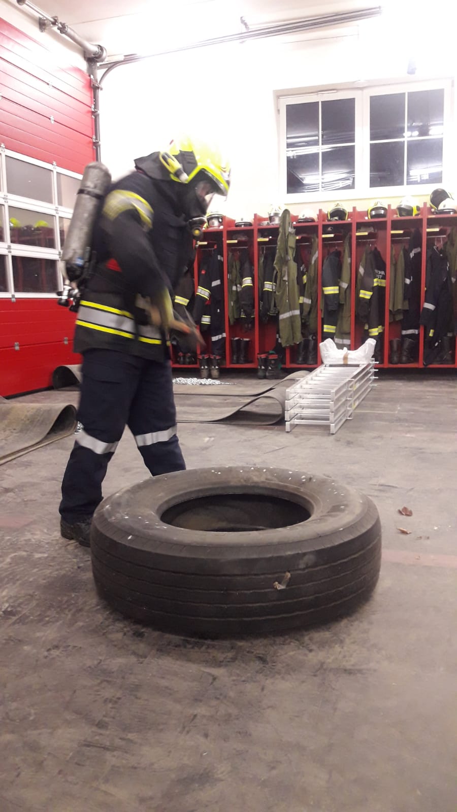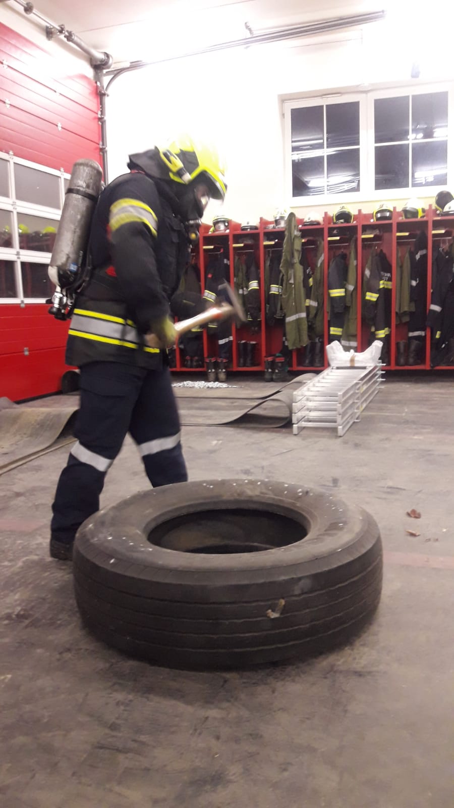 In 2 Minuten muss ein LKW Reifen (~47kg) mit einem Vorschlaghammer (~6kg) 3 meter weit geschlagen werden |