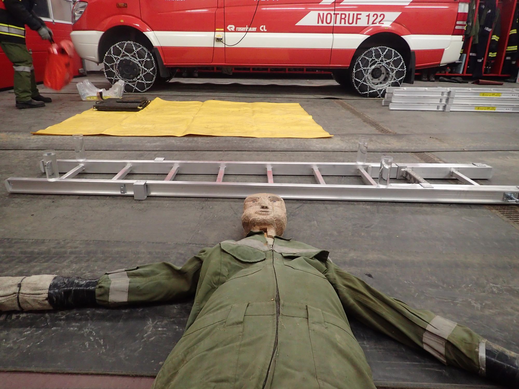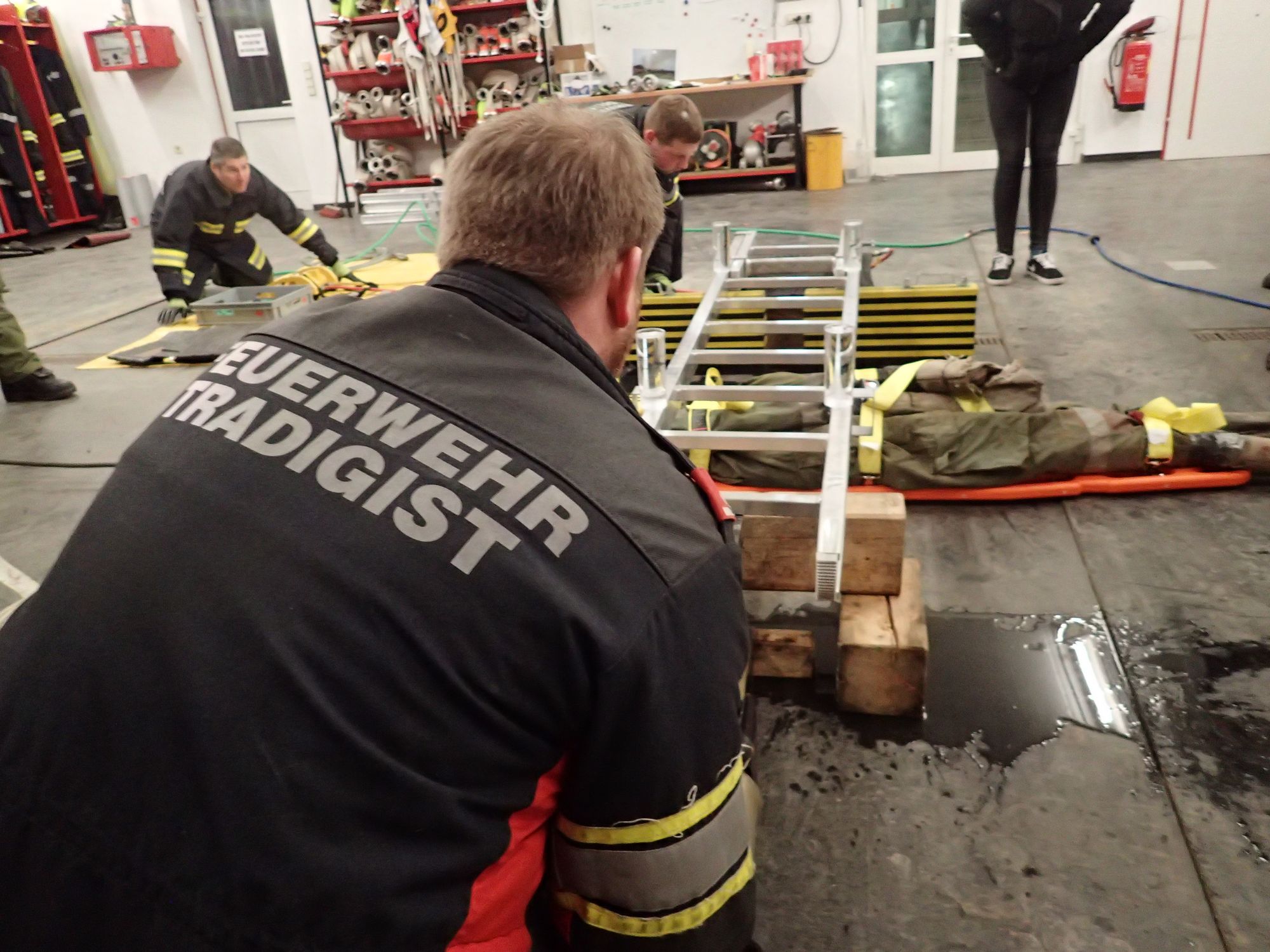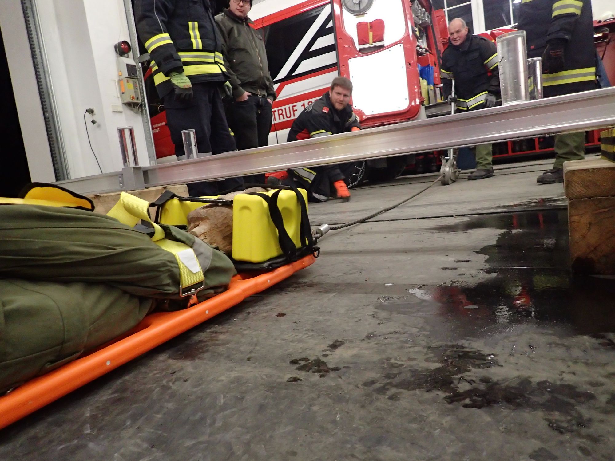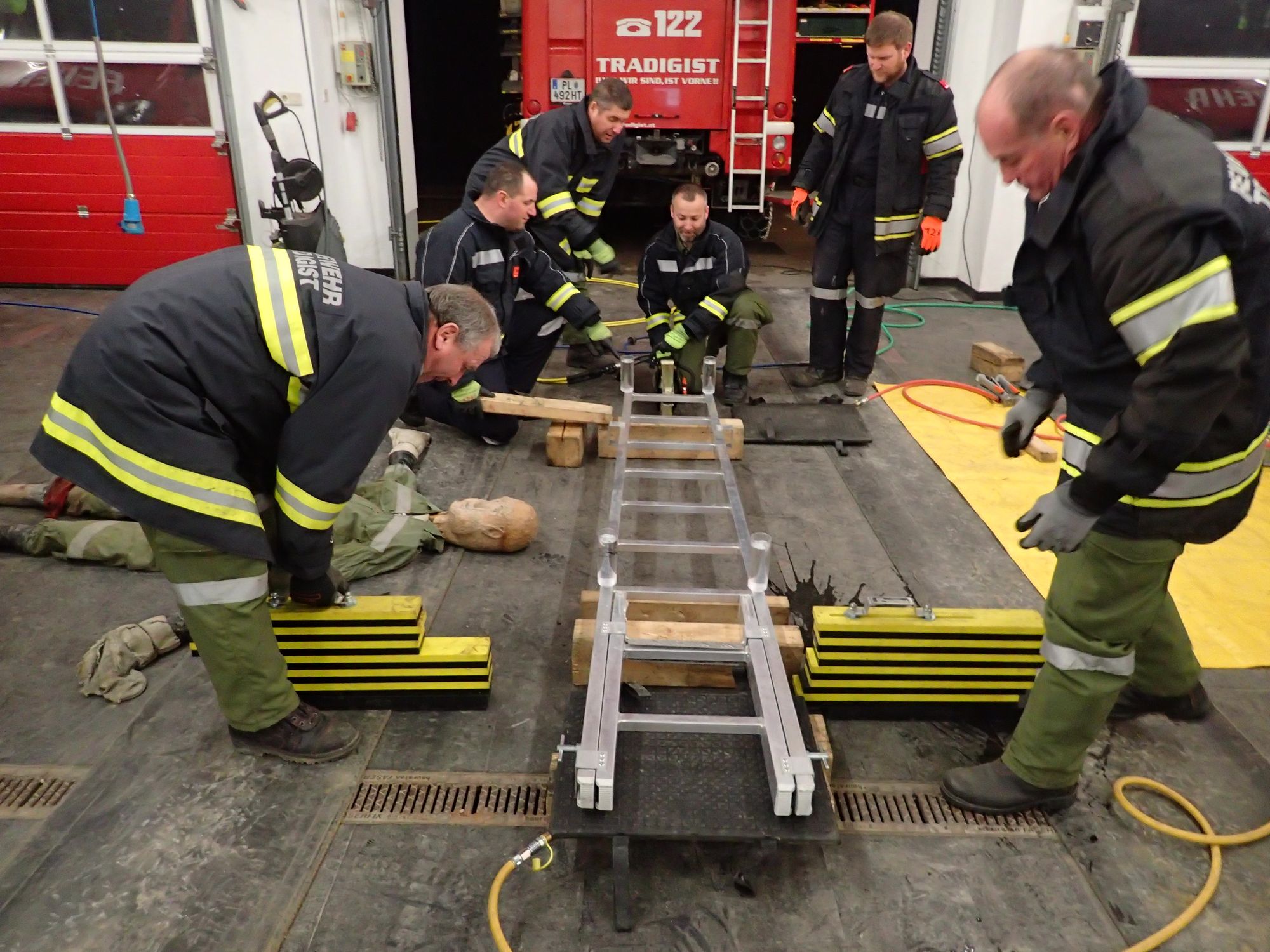 Es galt eine verunfallte Person sicher und möglichst schonend durch eine schmale Öffnung zu retten. Dazu musste ein Hindernis vorsichtig angehoben und fixiert werden. Mit Wasser gefüllte Becher zeigten jede Erschütterung und ruckartige Bewegung an, sodass konzentriertes und genaues Arbeiten gefordert war. Anschließend konnte die Person, an einem Spineboard gesichert, unter dem Hindernis durchgezogen werden.