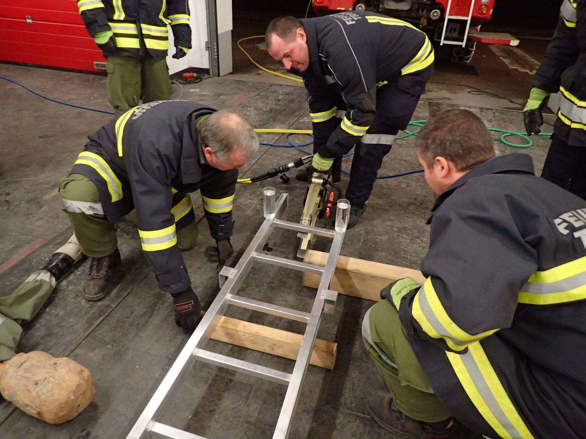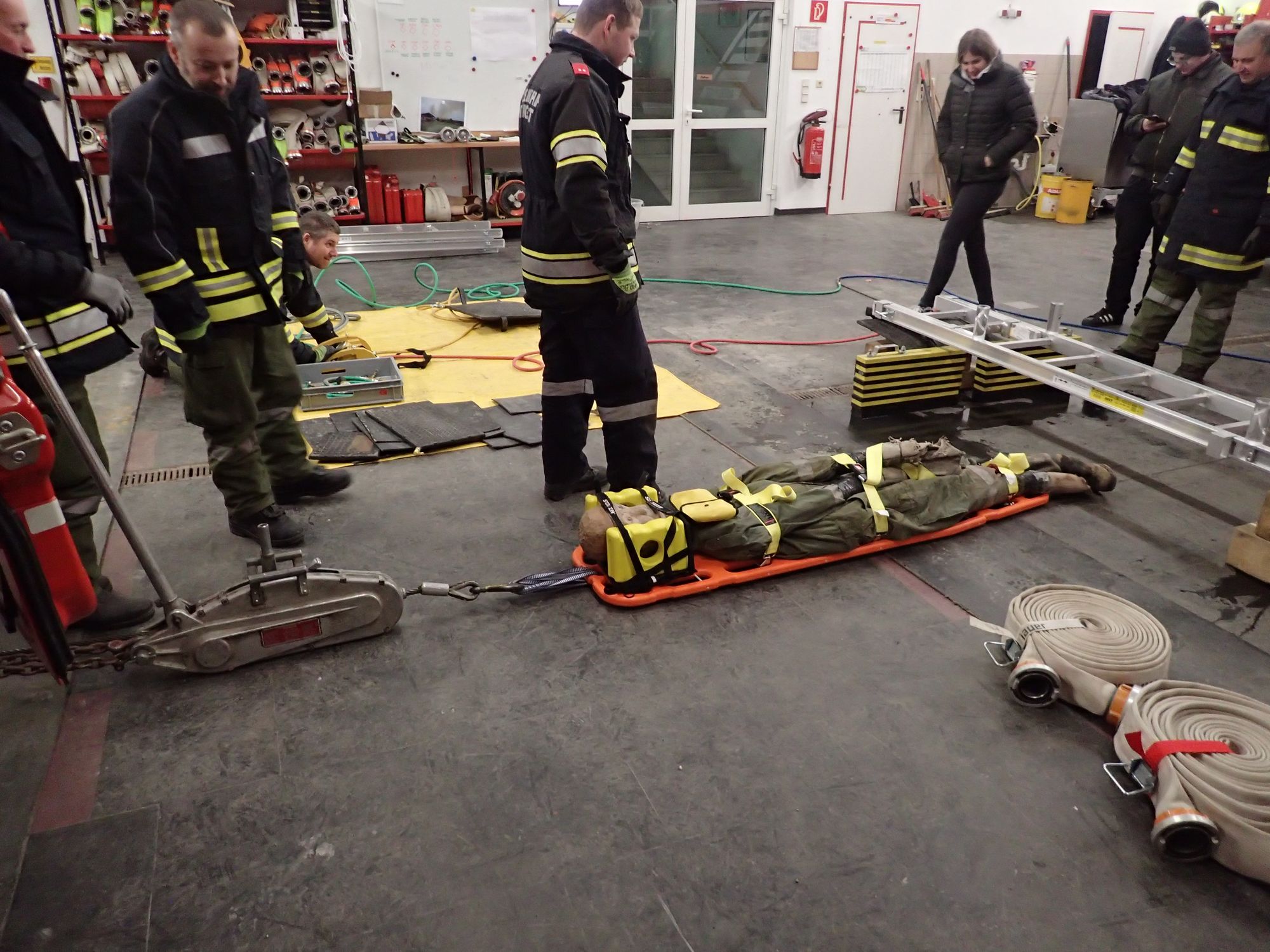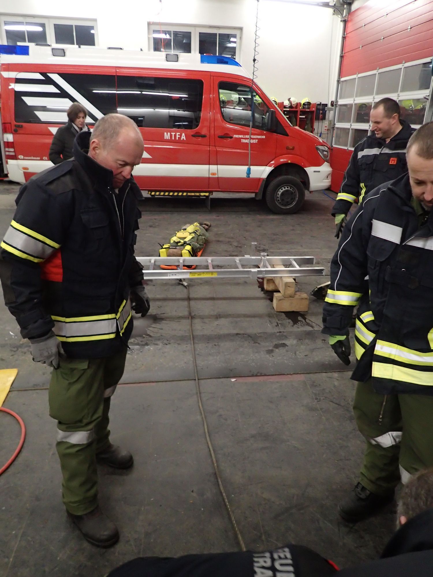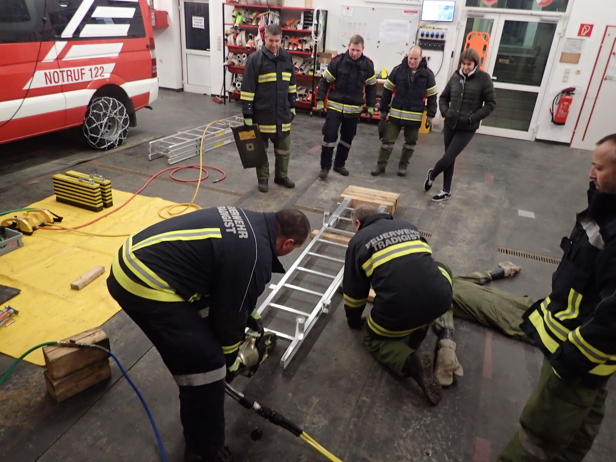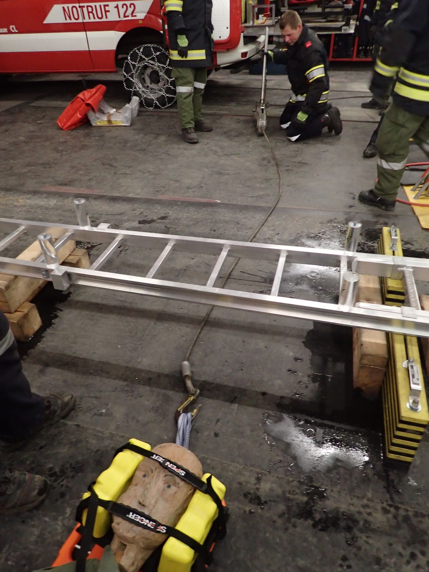 Es galt eine verunfallte Person sicher und möglichst schonend durch eine schmale Öffnung zu retten. Dazu musste ein Hindernis vorsichtig angehoben und fixiert werden. Mit Wasser gefüllte Becher zeigten jede Erschütterung und ruckartige Bewegung an, sodass konzentriertes und genaues Arbeiten gefordert war. Anschließend konnte die Person, an einem Spineboard gesichert, unter dem Hindernis durchgezogen werden.