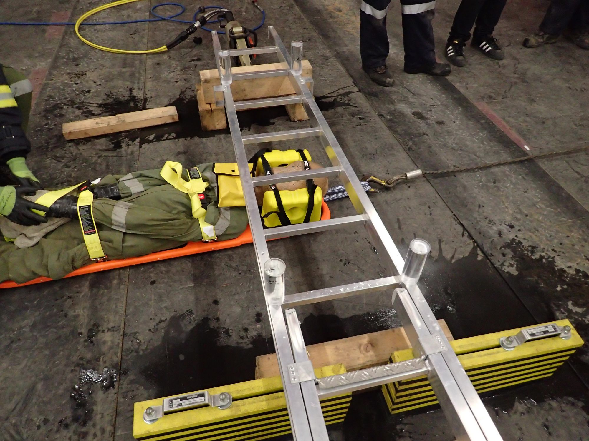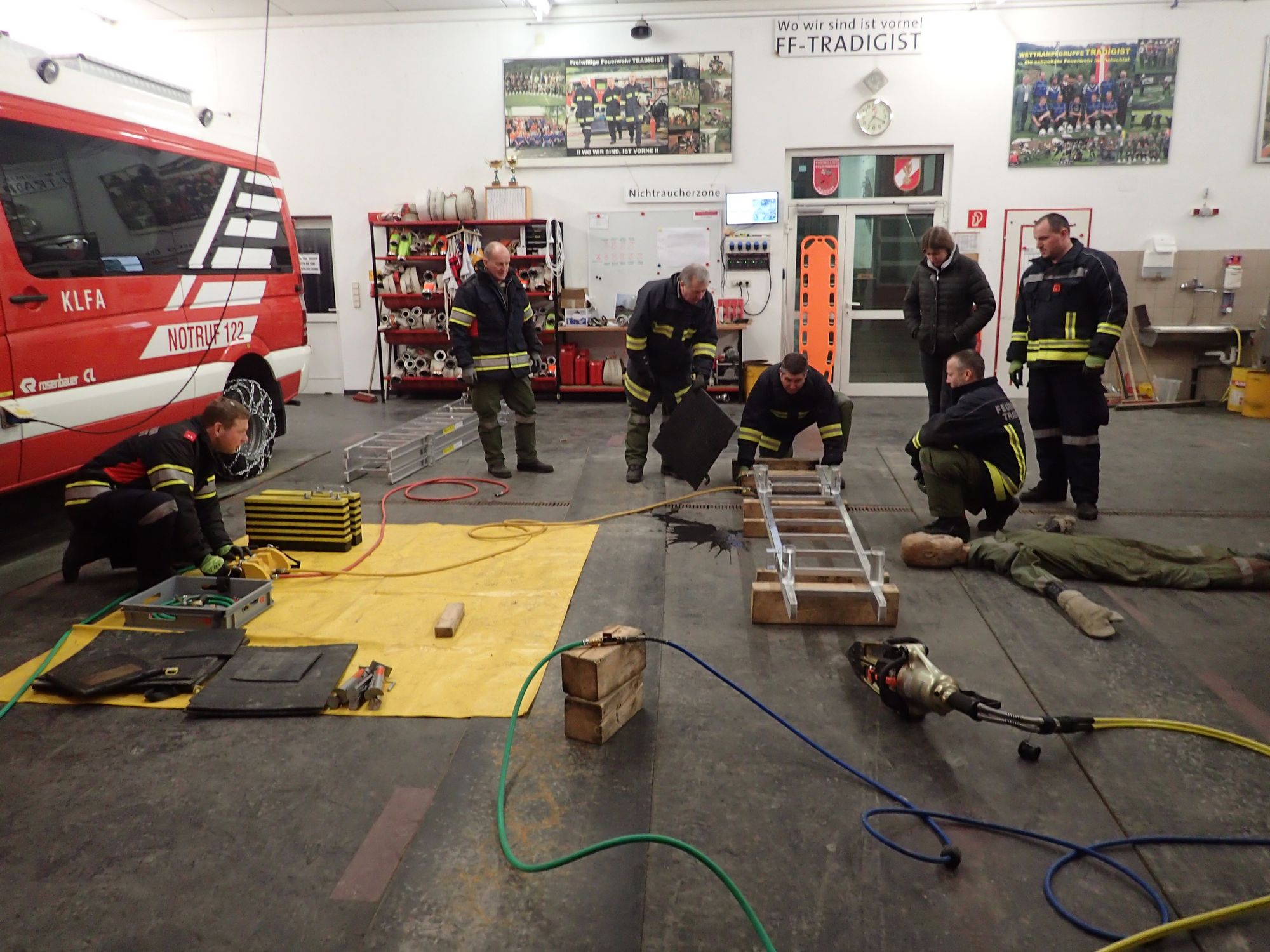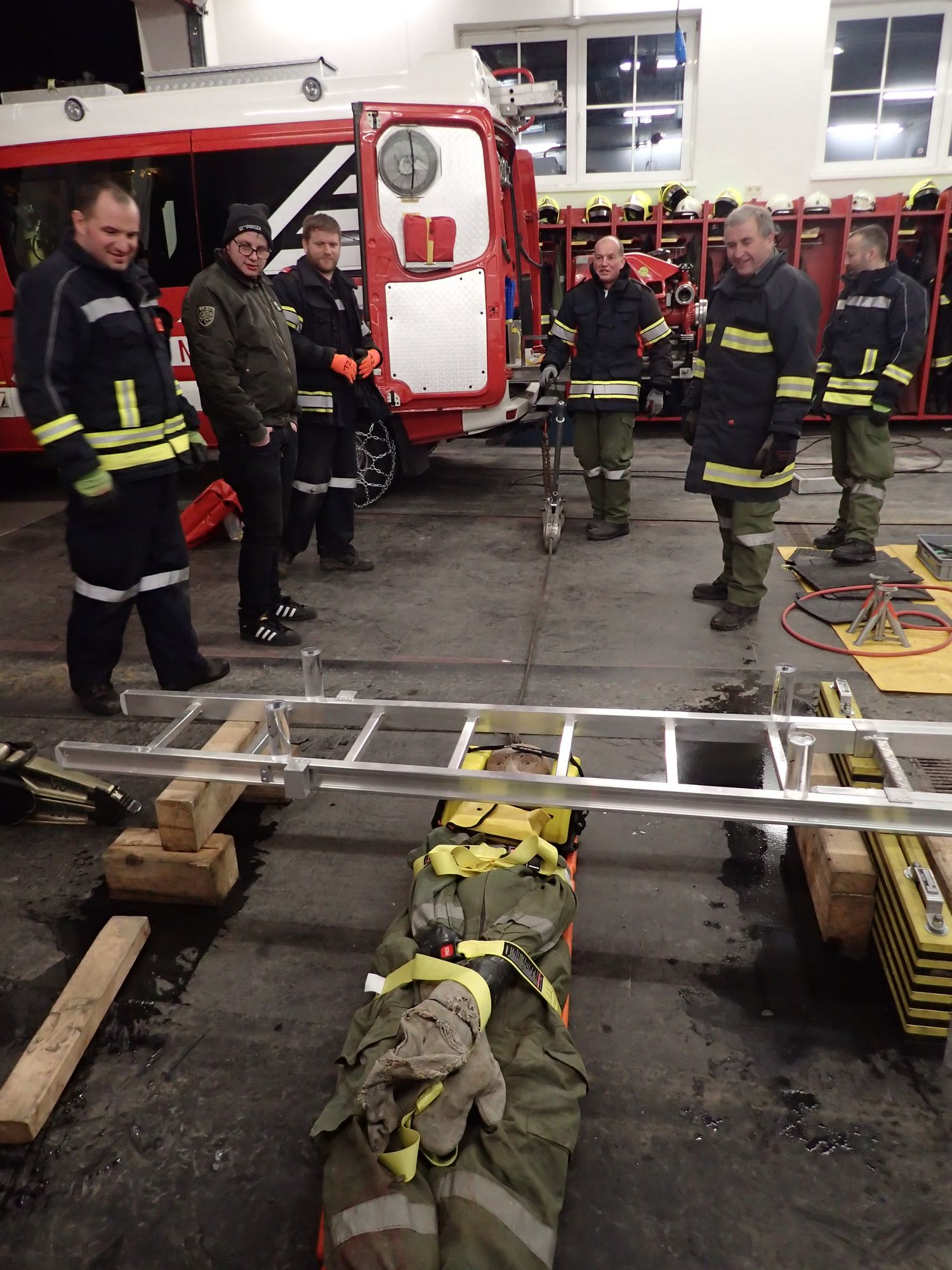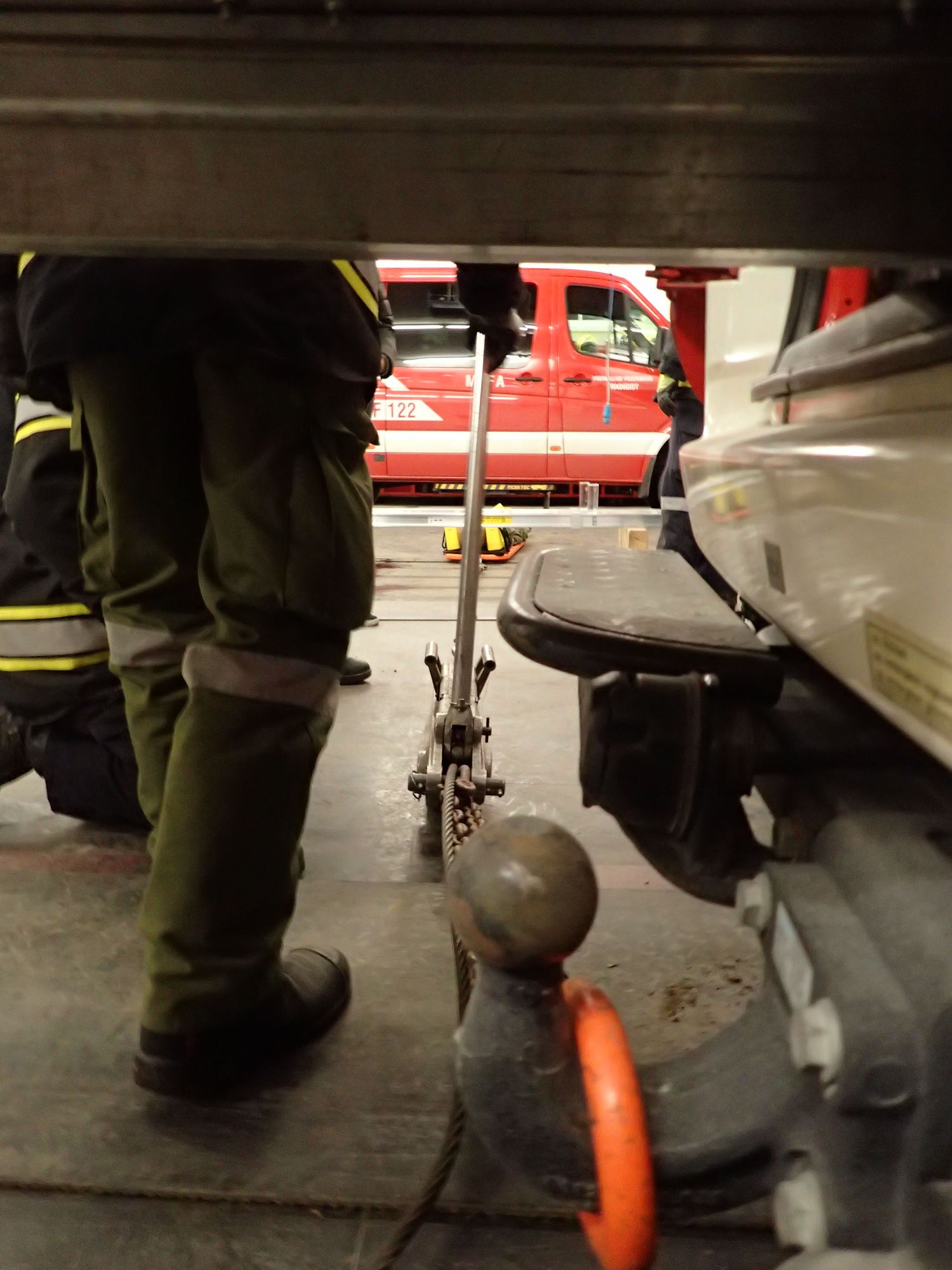 Es galt eine verunfallte Person sicher und möglichst schonend durch eine schmale Öffnung zu retten. Dazu musste ein Hindernis vorsichtig angehoben und fixiert werden. Mit Wasser gefüllte Becher zeigten jede Erschütterung und ruckartige Bewegung an, sodass konzentriertes und genaues Arbeiten gefordert war. Anschließend konnte die Person, an einem Spineboard gesichert, unter dem Hindernis durchgezogen werden.