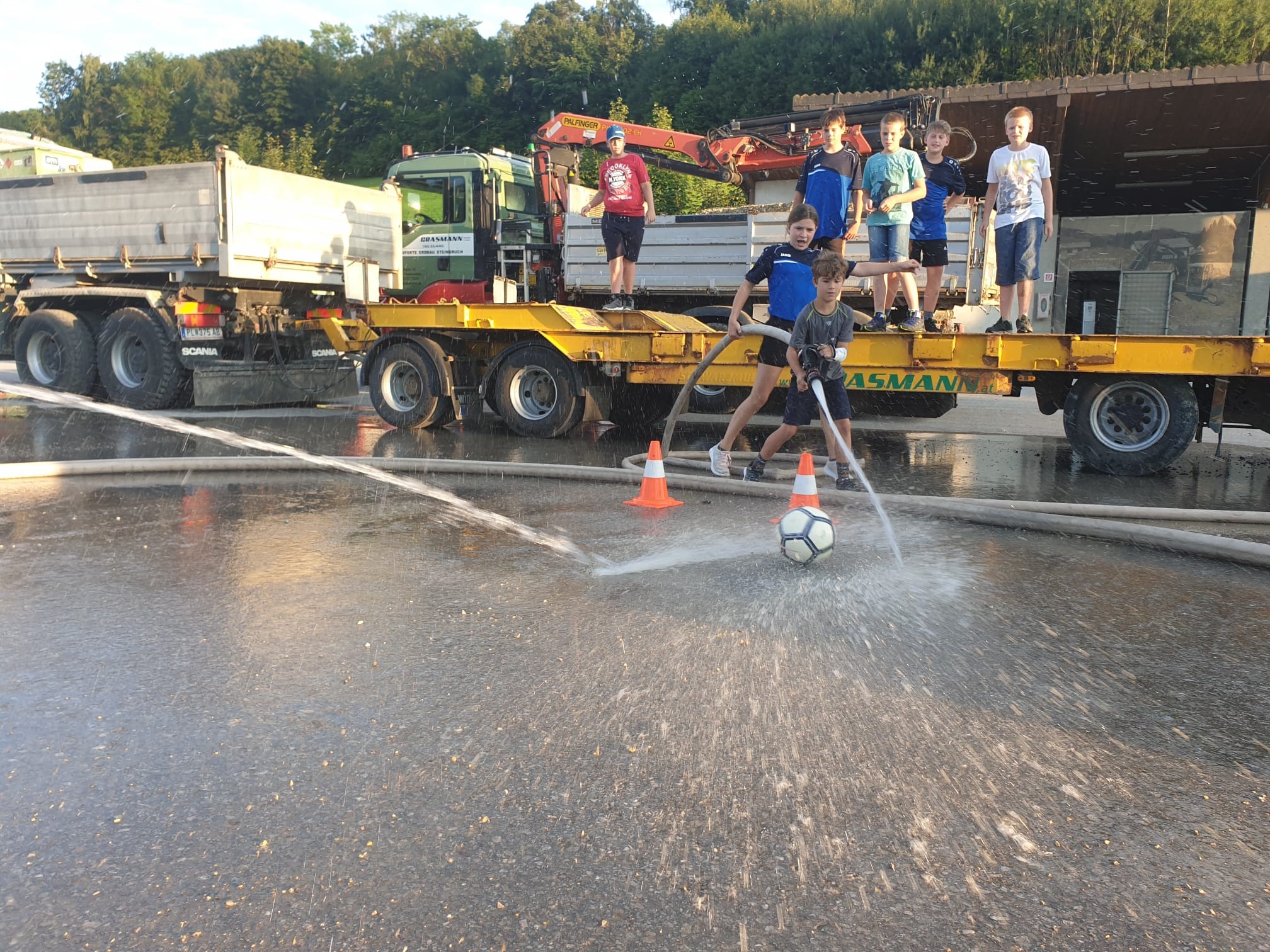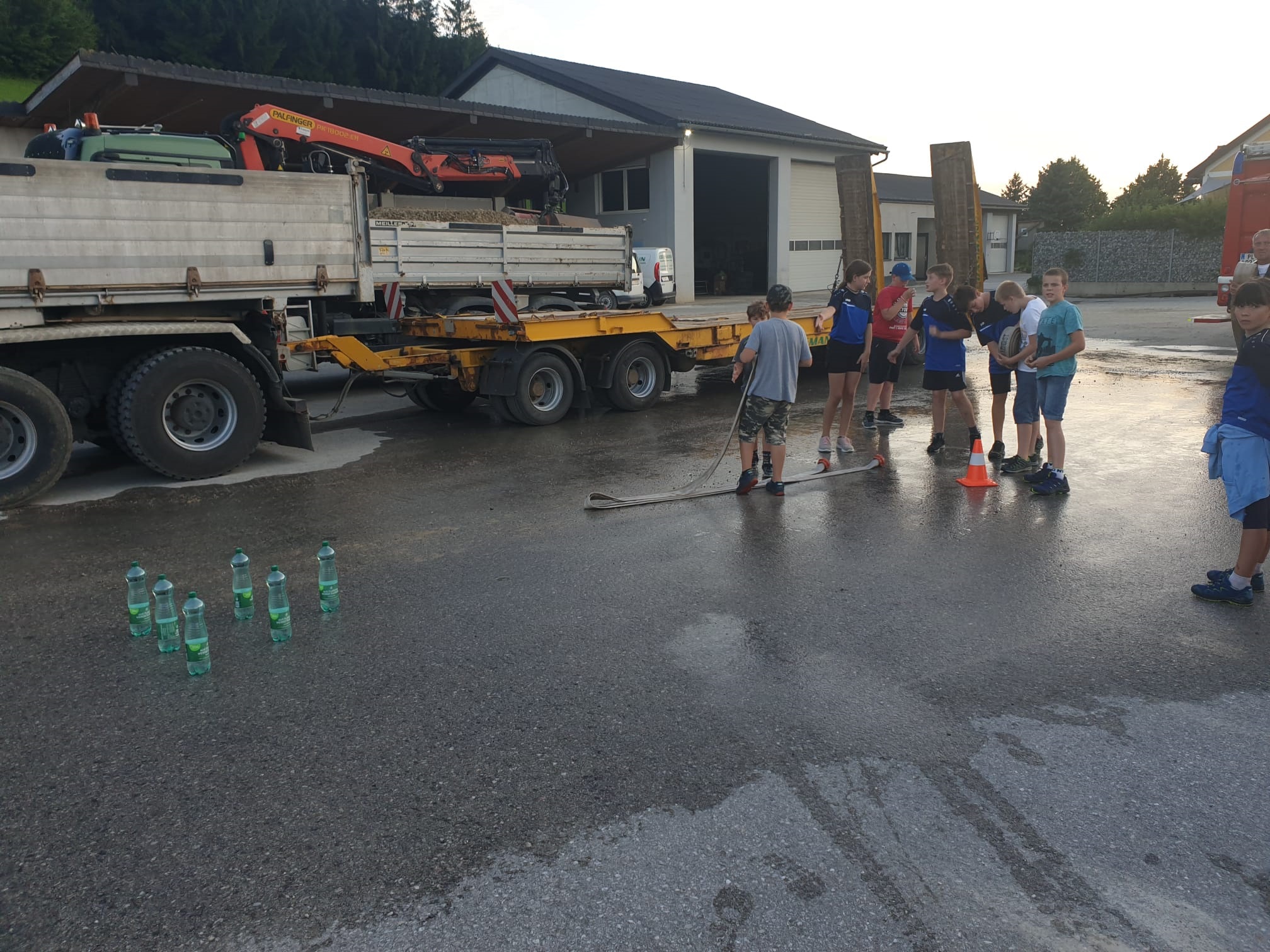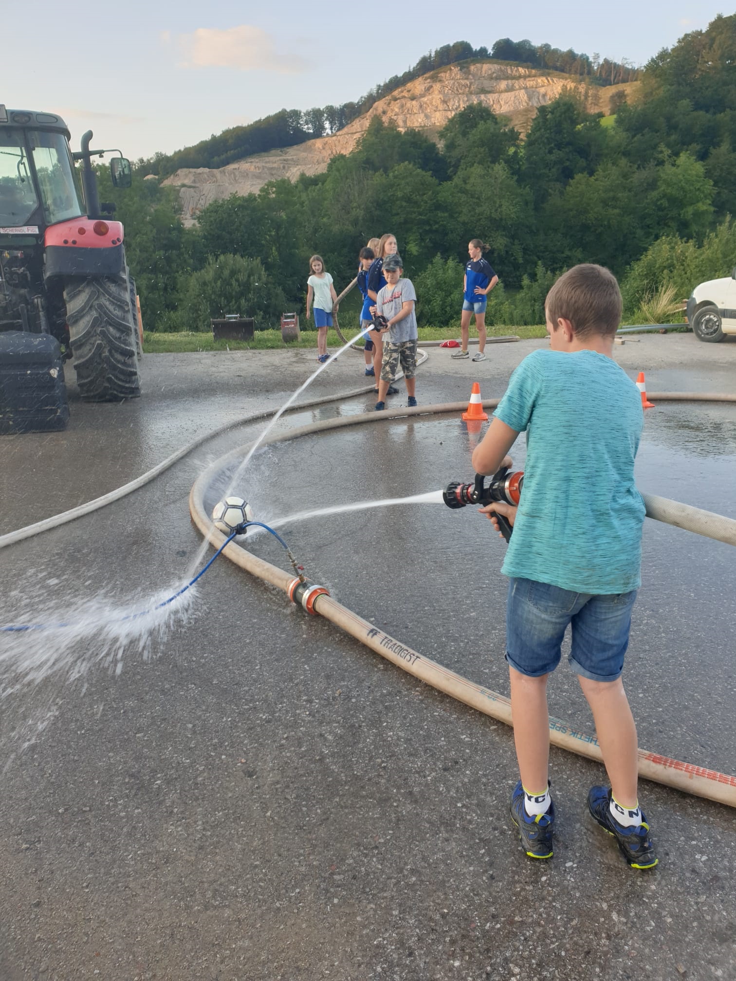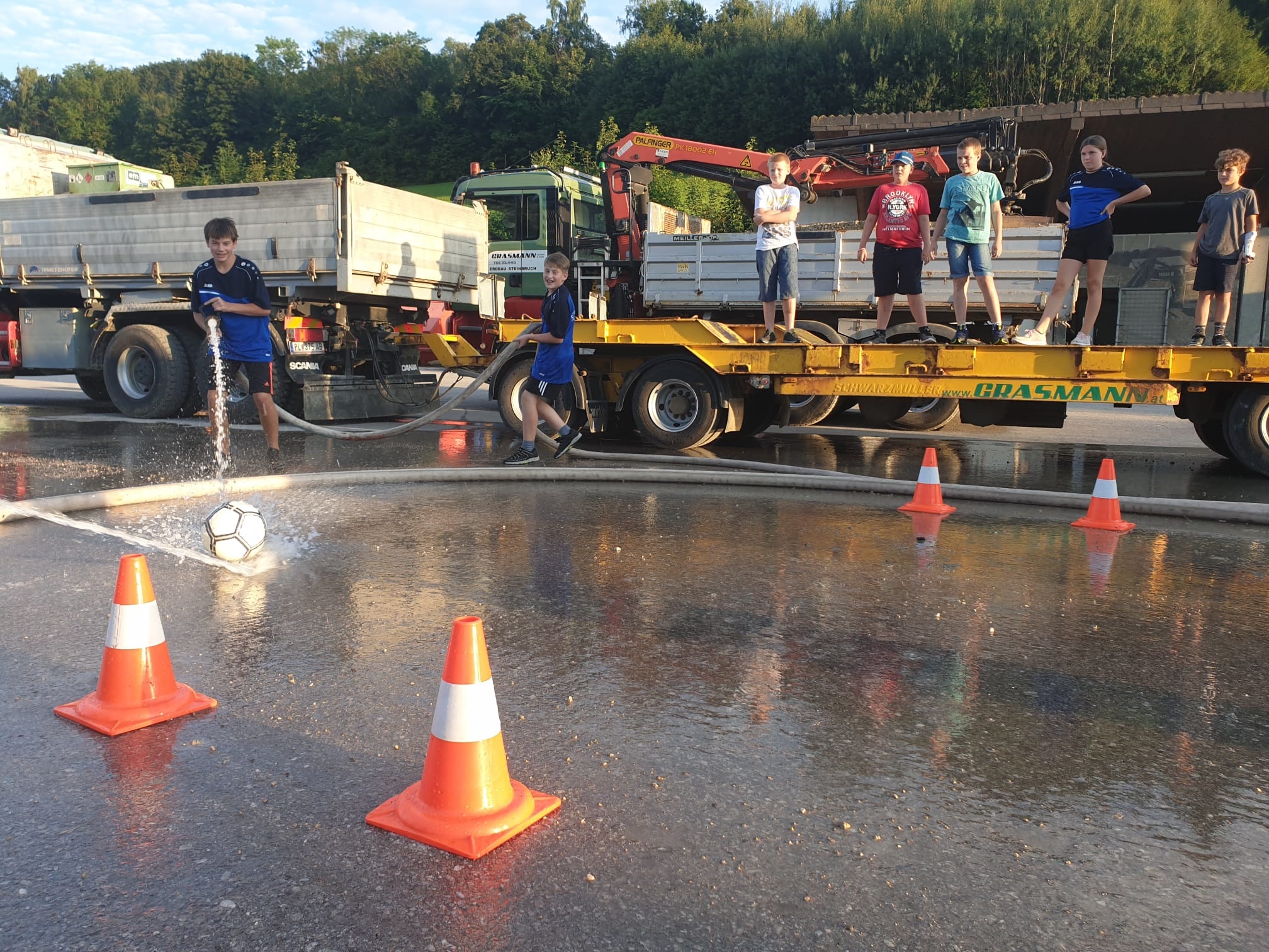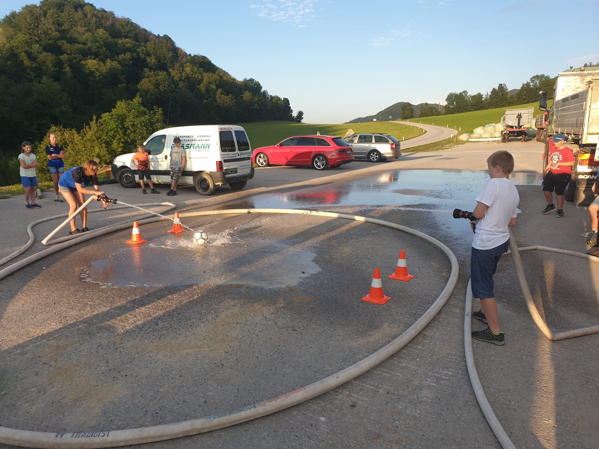 2 Verkehrsleitkegeln bilden das Tor. Mittels Hohlstrahlrohr versuchen den Ball ins gegnerische Tor zu spritzen. - "Feuerwehrschlauch richtig wickeln"