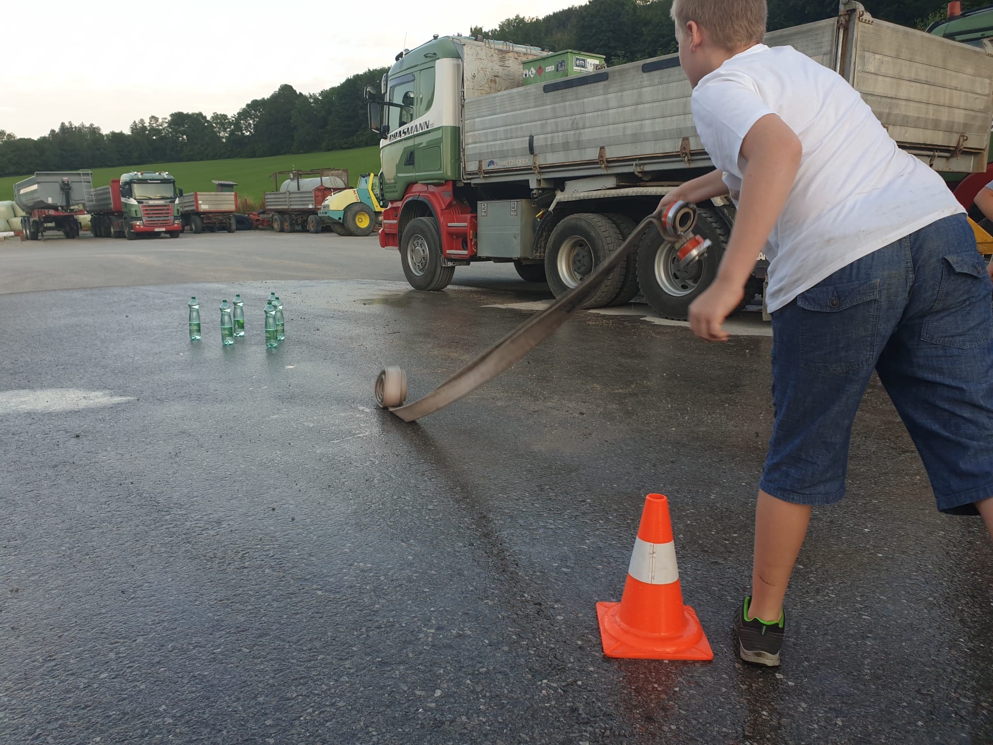 Anschließend Schlauchkegeln - Wasserflaschen umschmeißen mit C-Schlauch - Wettkampf zweier Gruppen, wer als Schnellster einen Golfball durch einen B-Schlauch durchbringt.