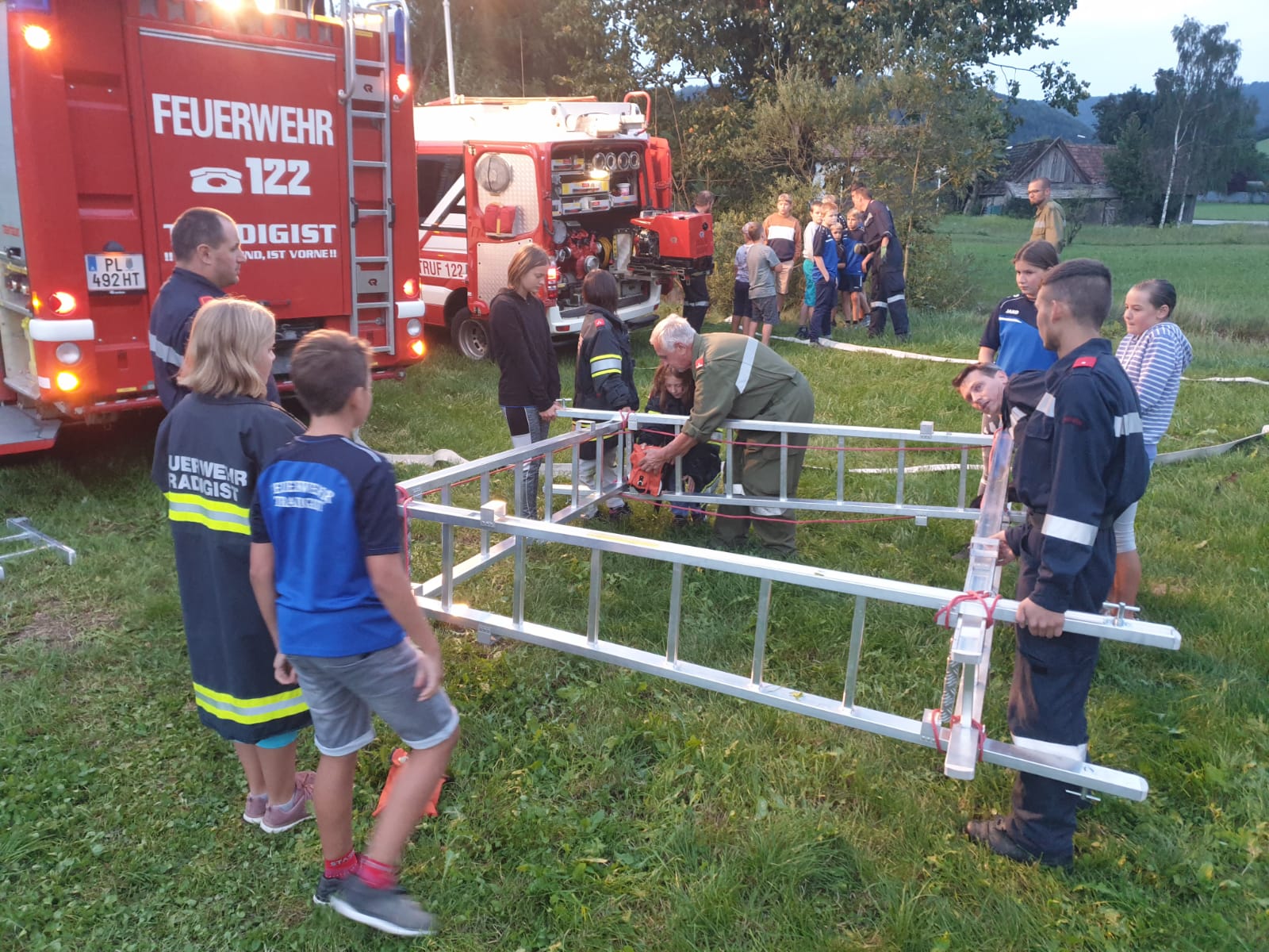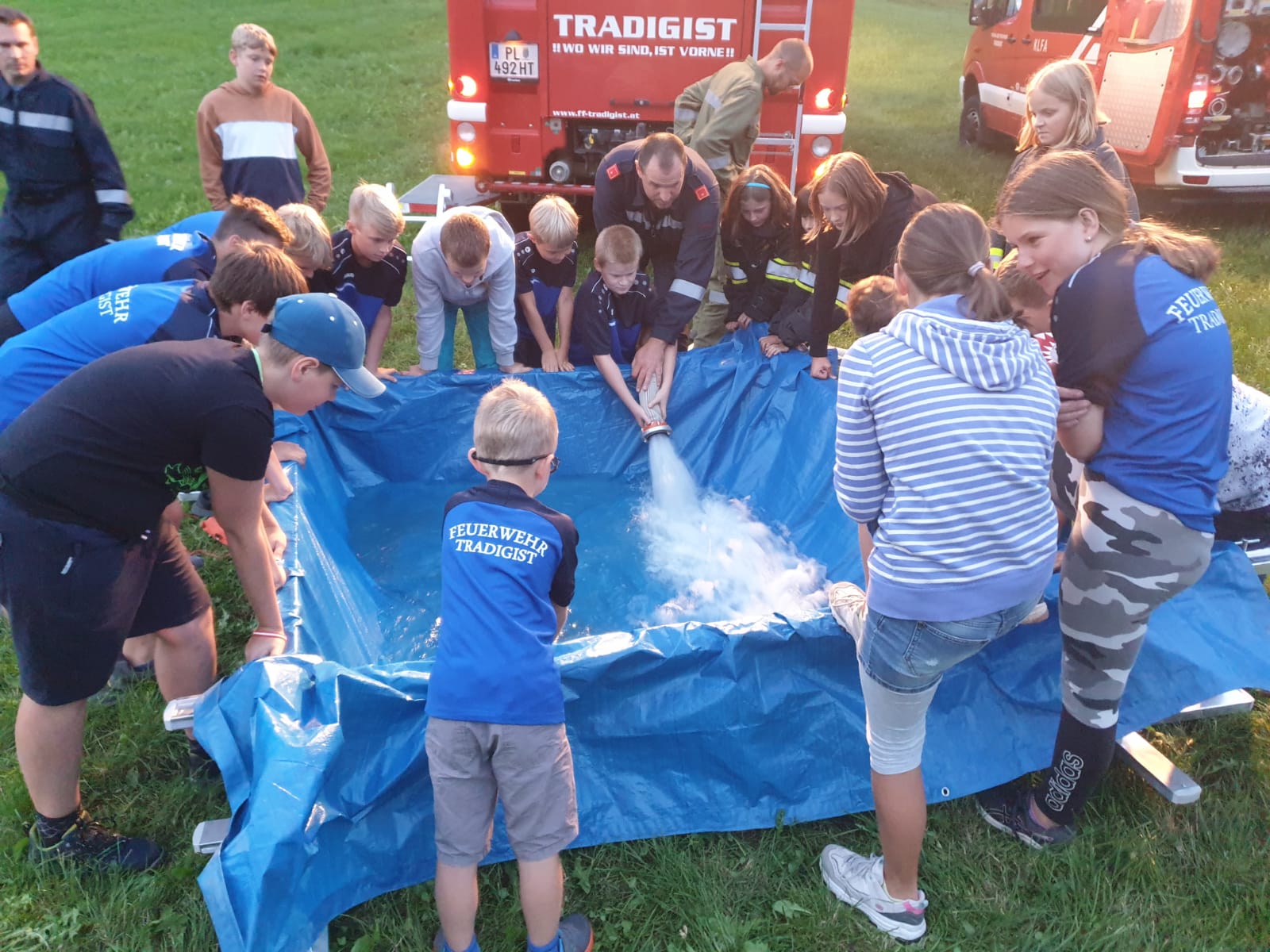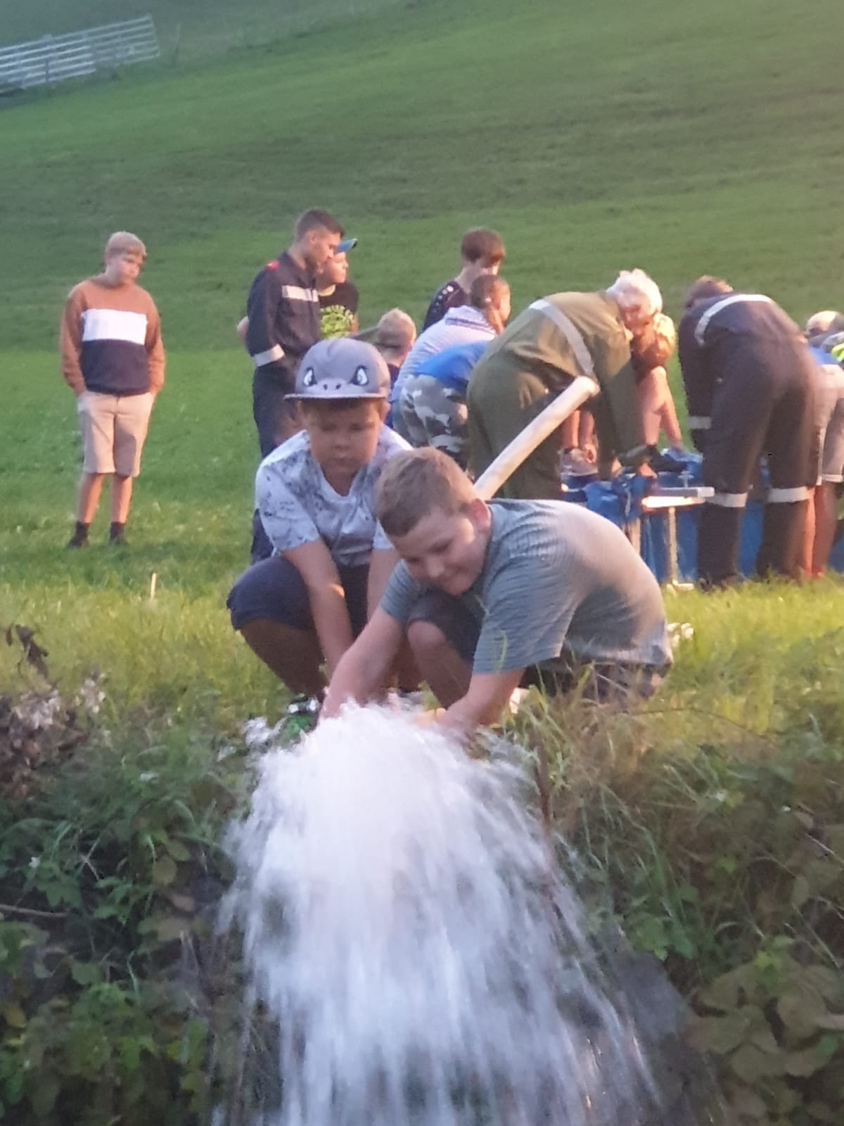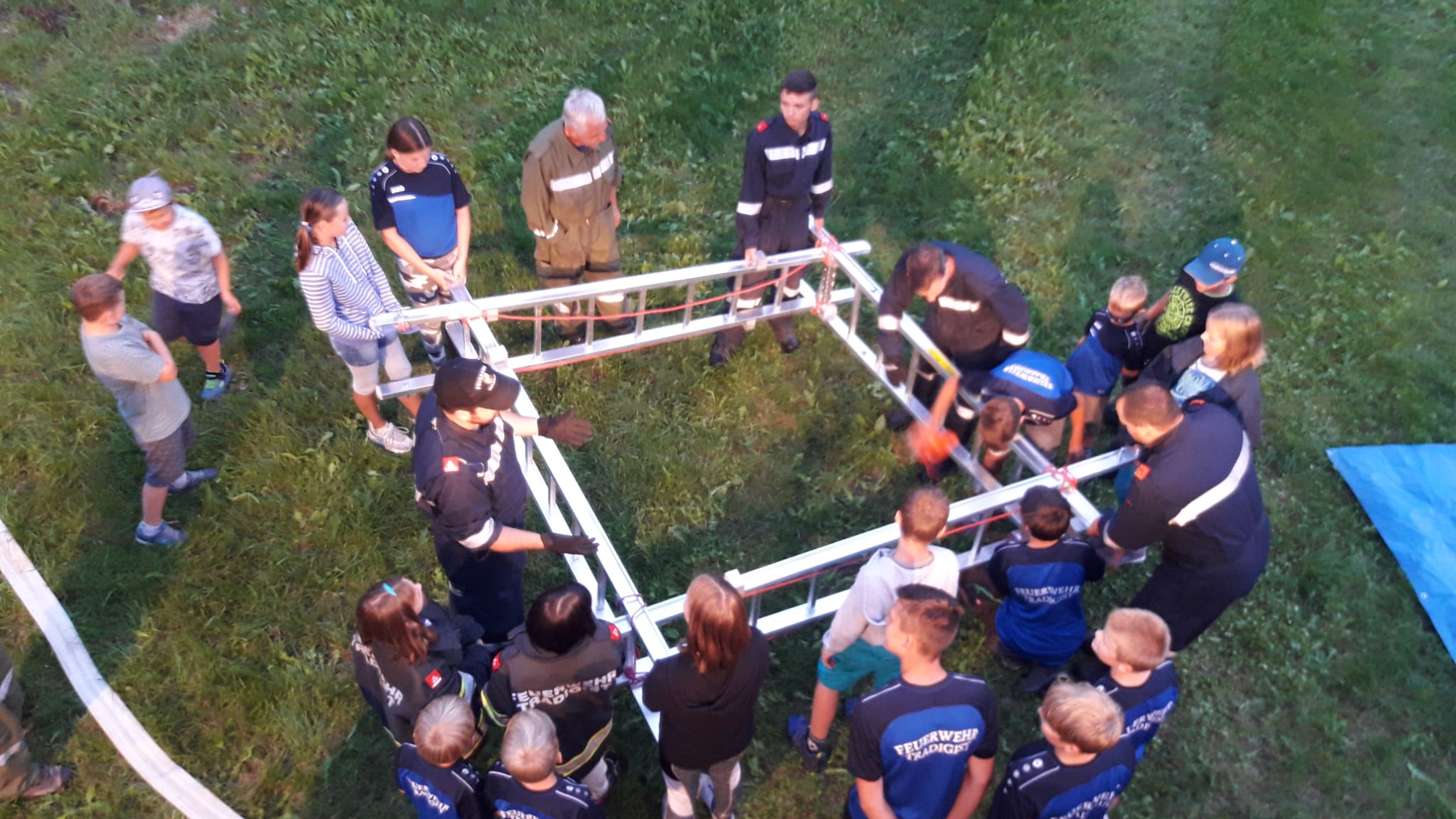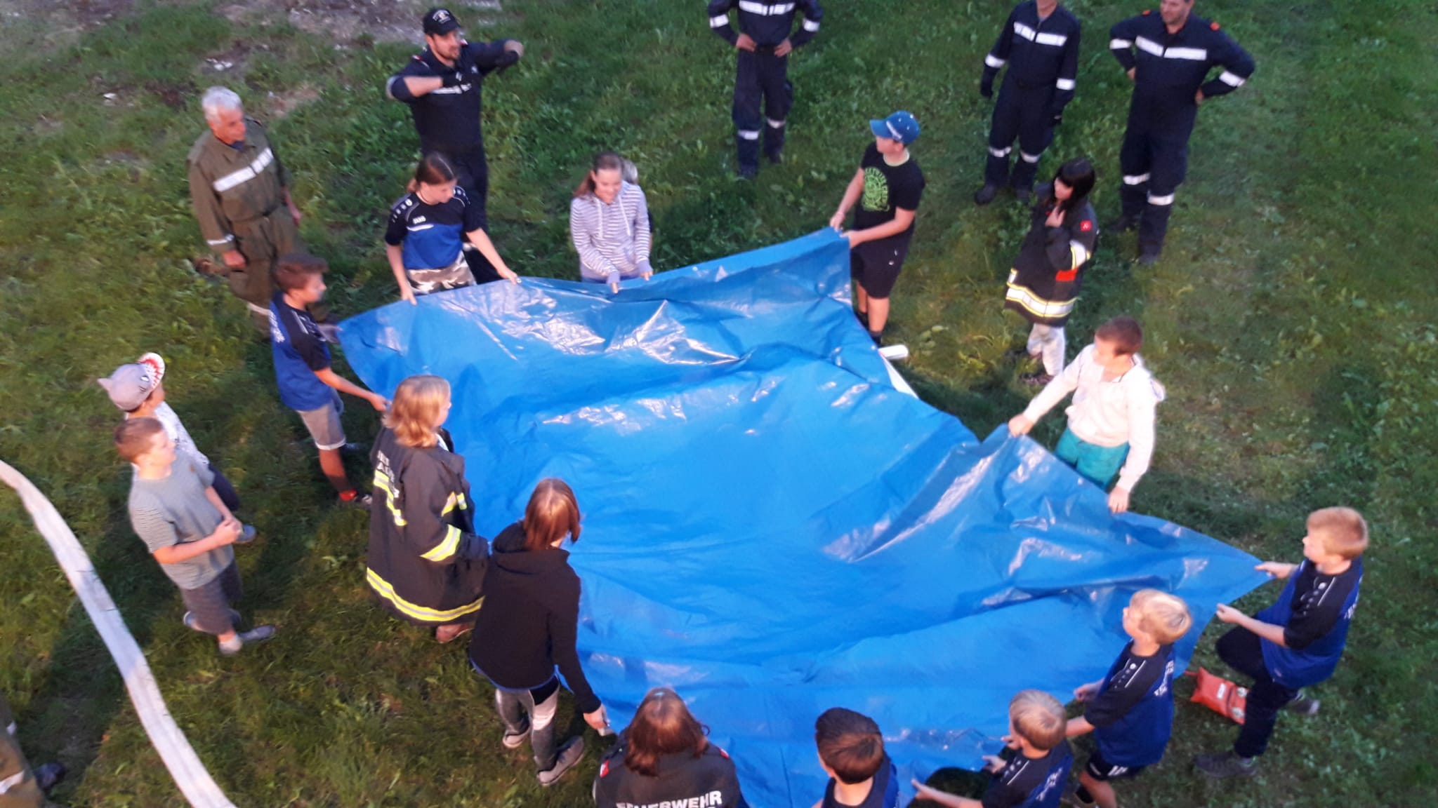 Danach wurde aus Steckleitern und einer Plane ein Auffangbecken (z.B. für austretende Schadstoffe) errichtet. Zur Demonstration wurde das Becken mit Wasser gefüllt und wieder ausgepumpt.