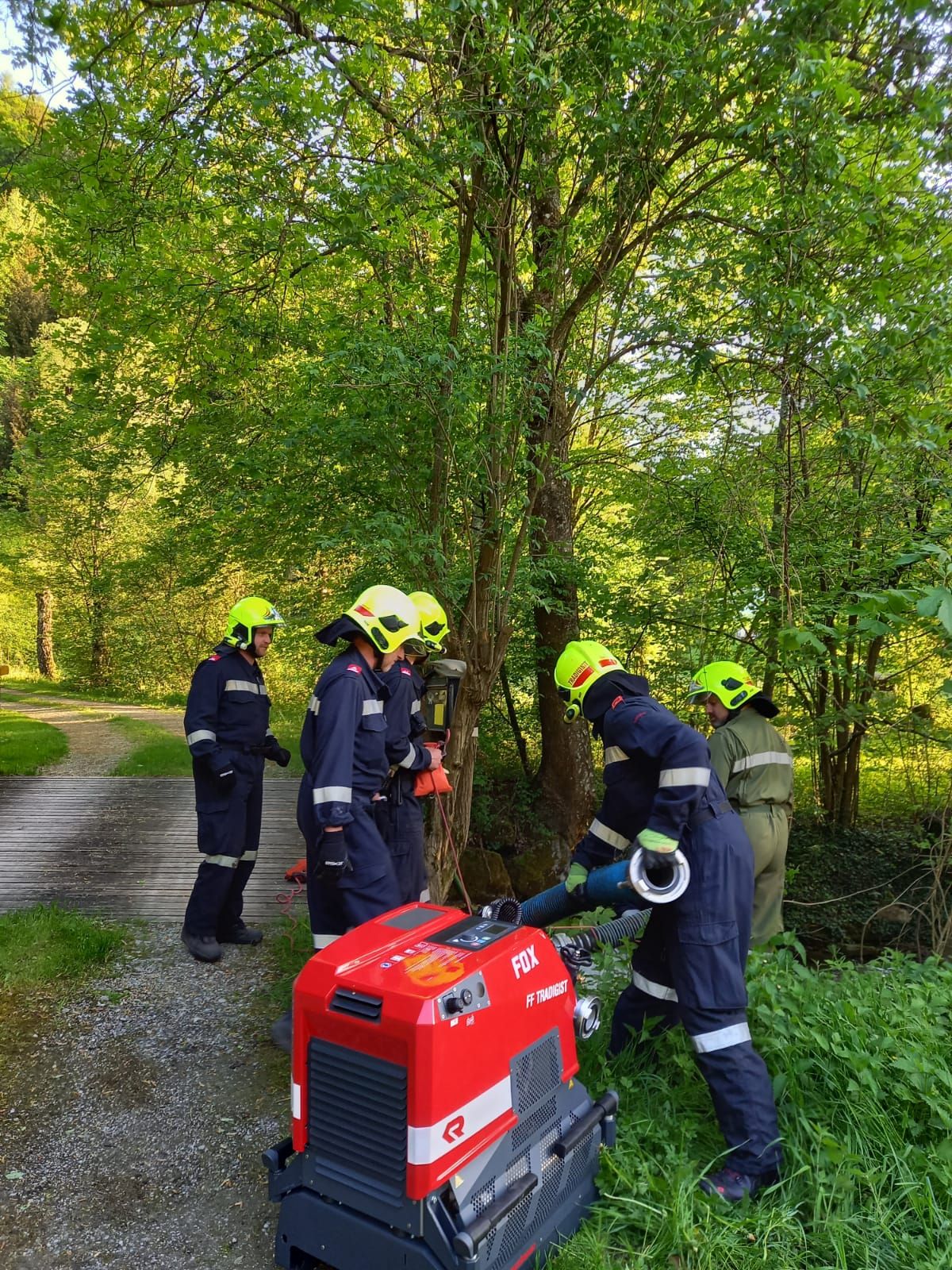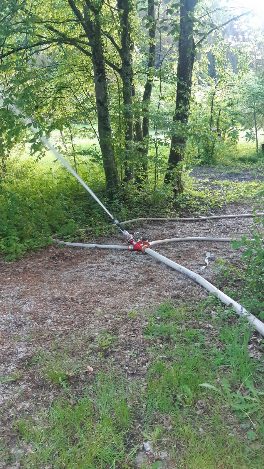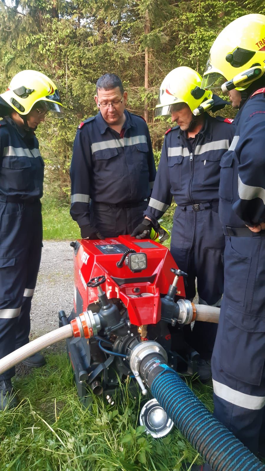 Am Abend desselben Tages wurde noch eine Übung mit der neuen Tragkraftspritze durchgeführt. Es wurde aus dem Bach angesaugt und eine Löschleitung aufgebaut.