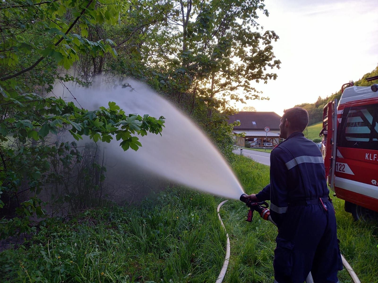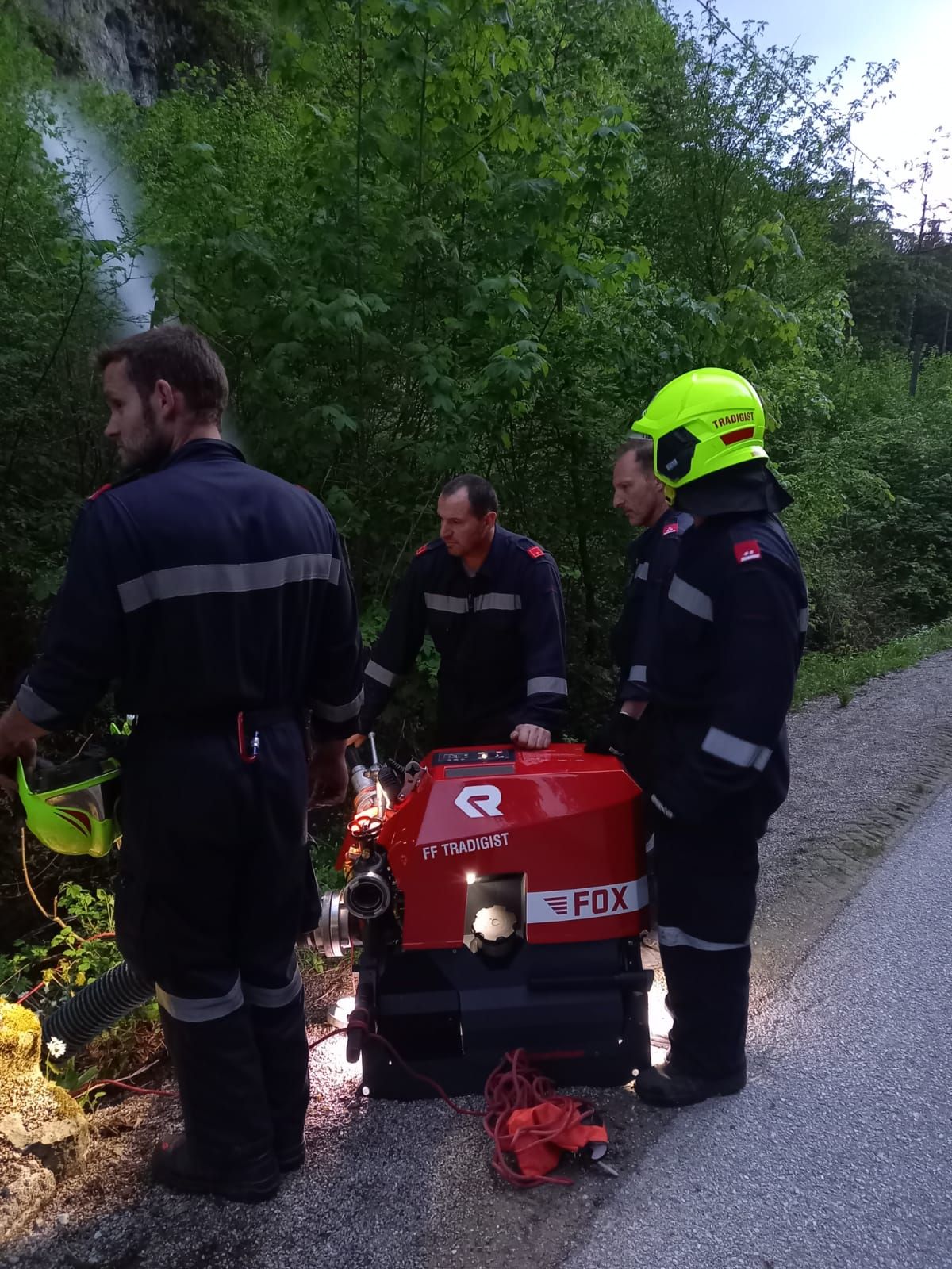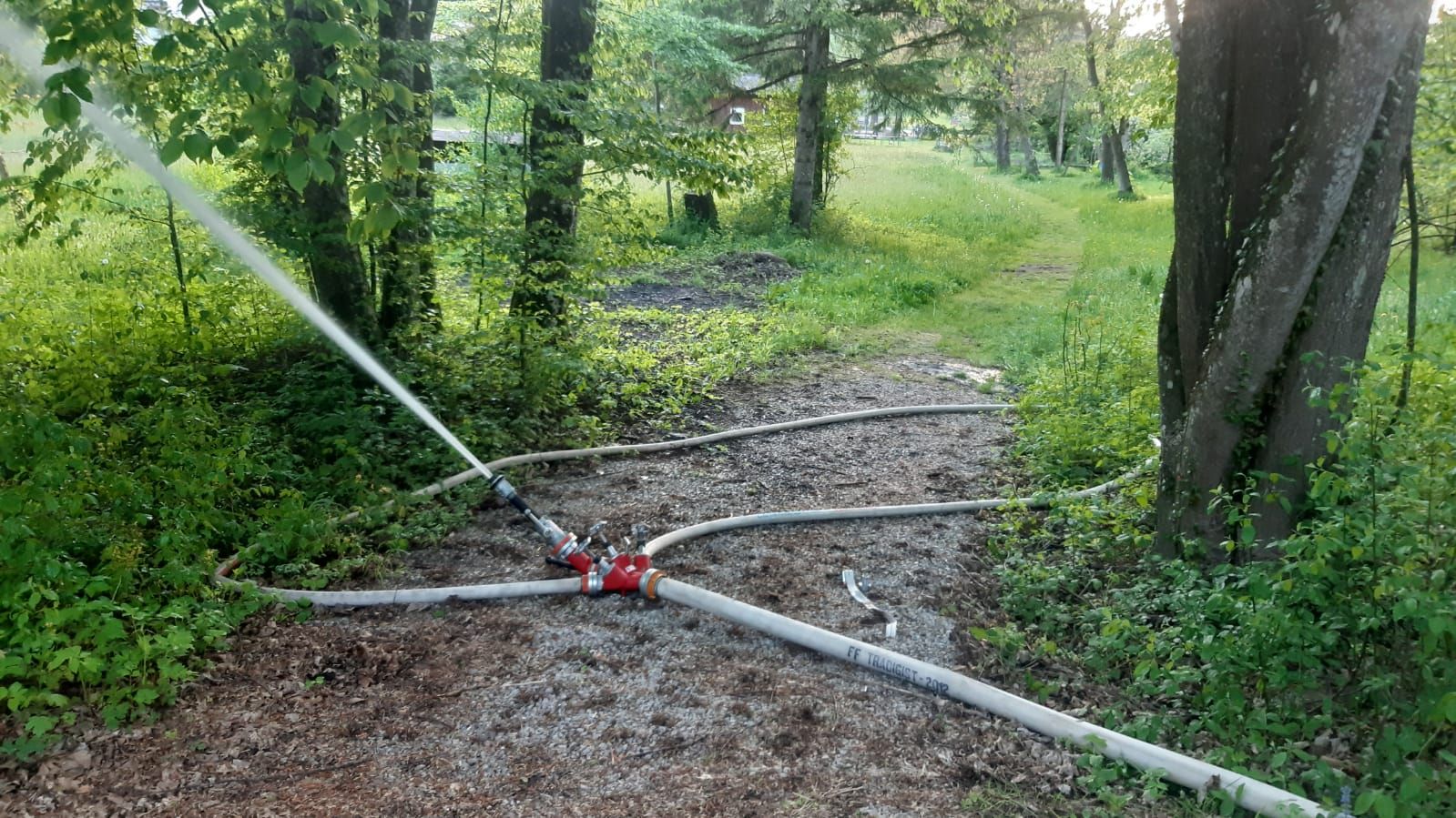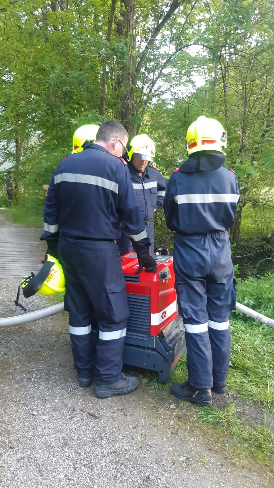Am Abend desselben Tages wurde noch eine Übung mit der neuen Tragkraftspritze durchgeführt. Es wurde aus dem Bach angesaugt und eine Löschleitung aufgebaut.