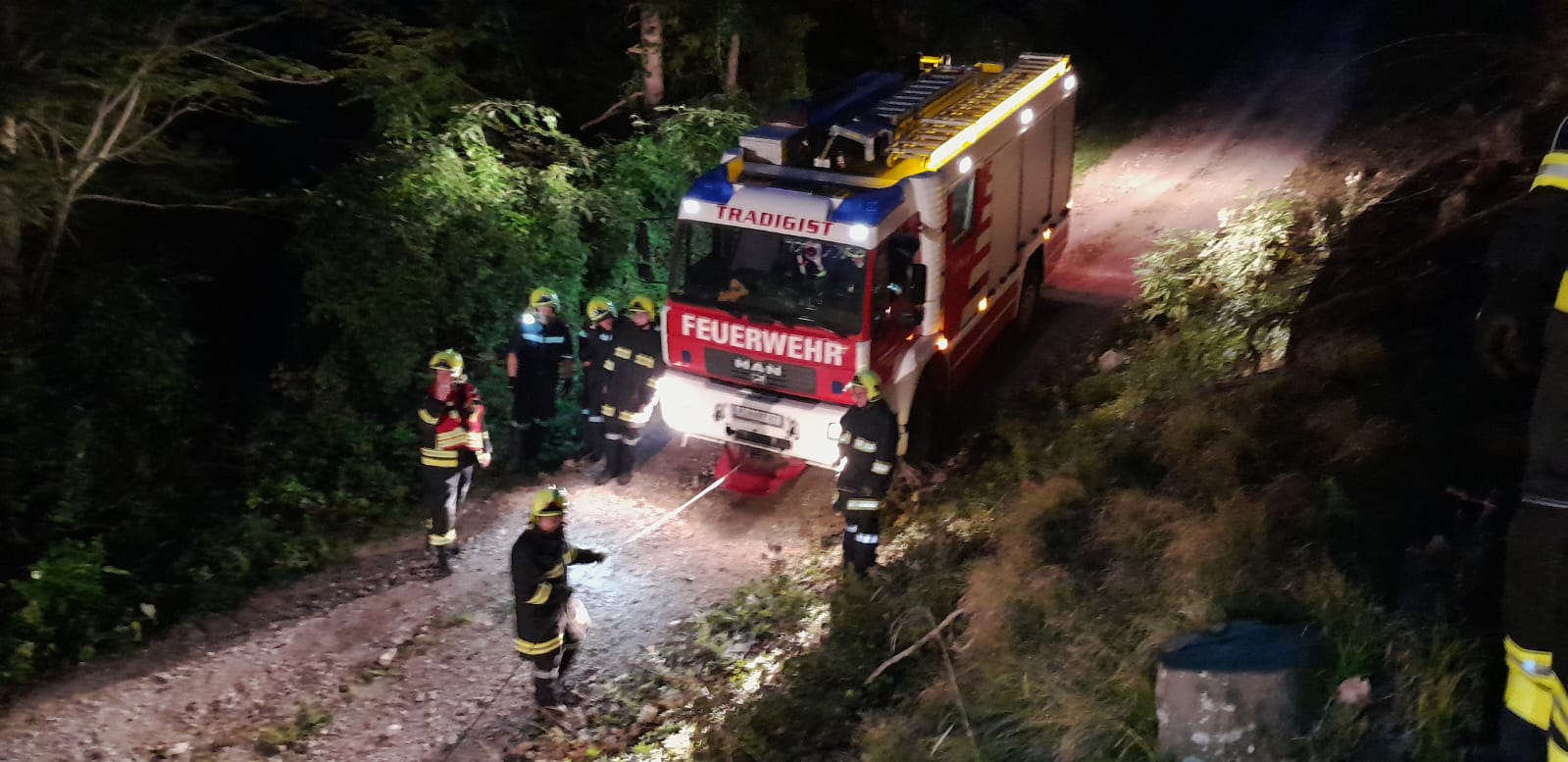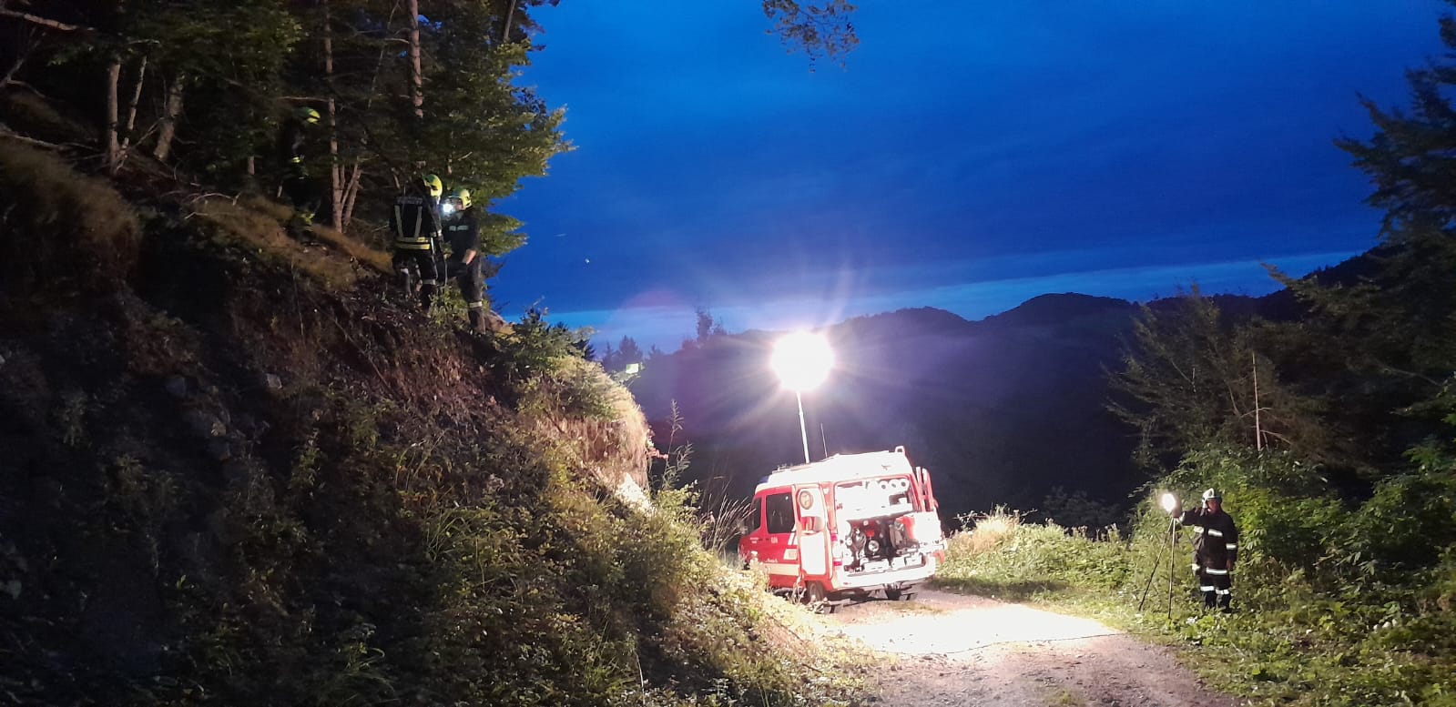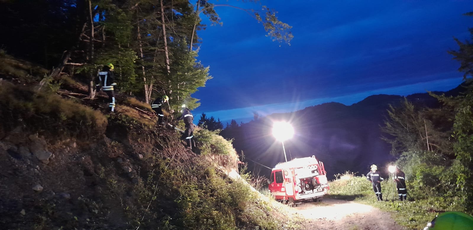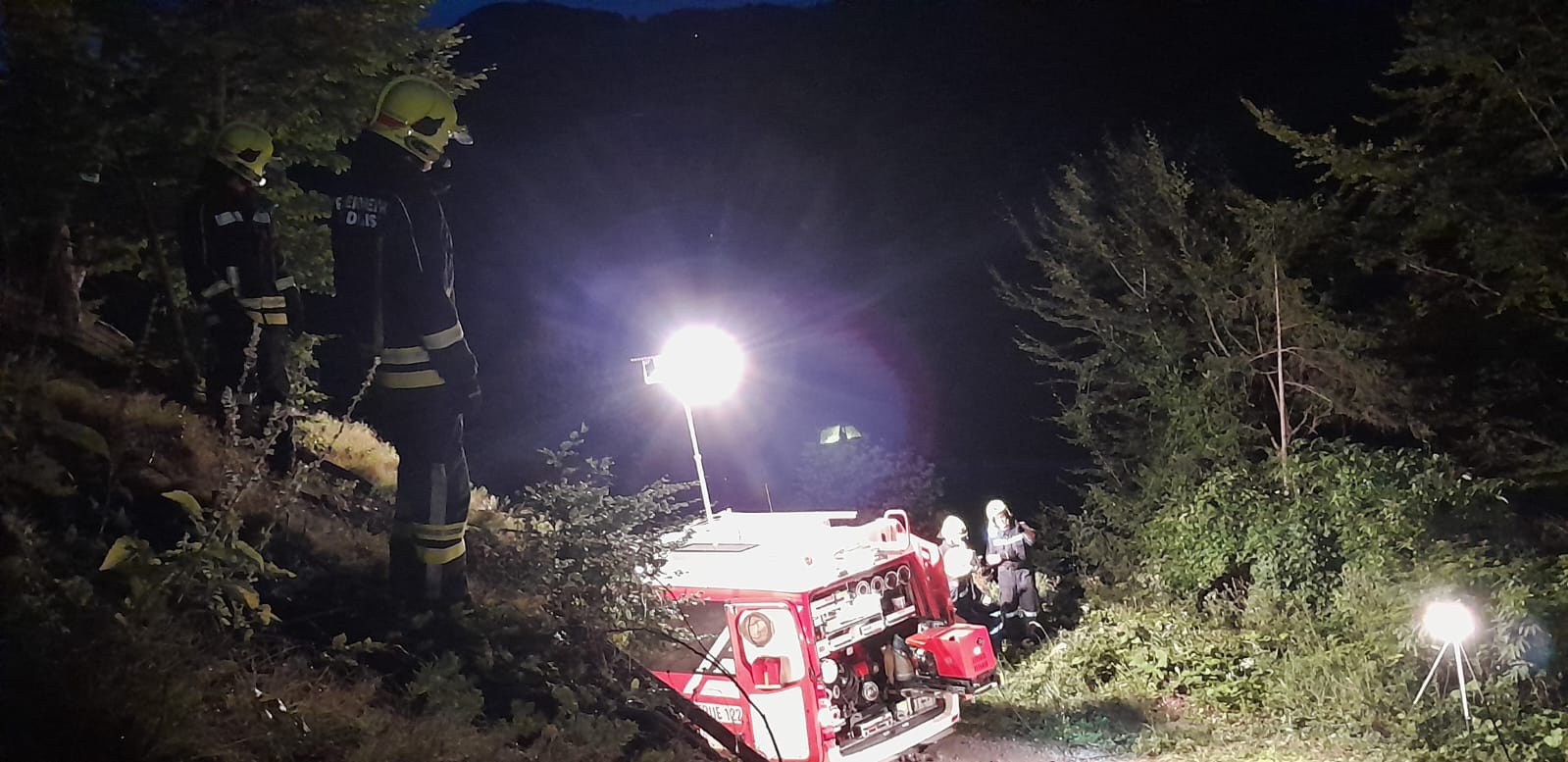 Übungsannahme war, daß ein PKW von einem Forstweg abgekommen sei und wieder zurück auf den Weg gezogen werden sollte. Zum Vergleich wurde auch die Bergung mit der Seilwinde des TLFA 3000 und einer Umlenkrolle durchgeführt.