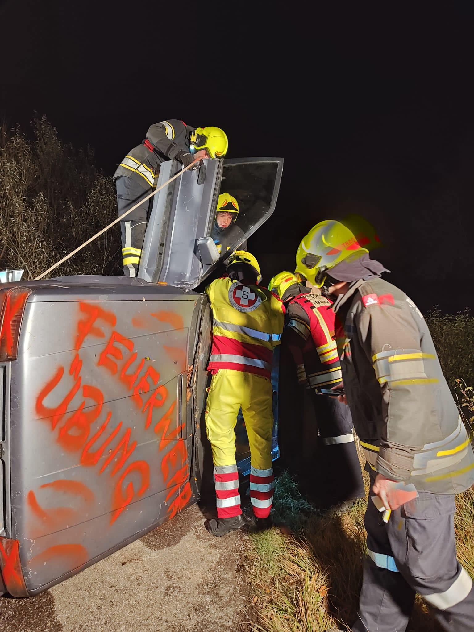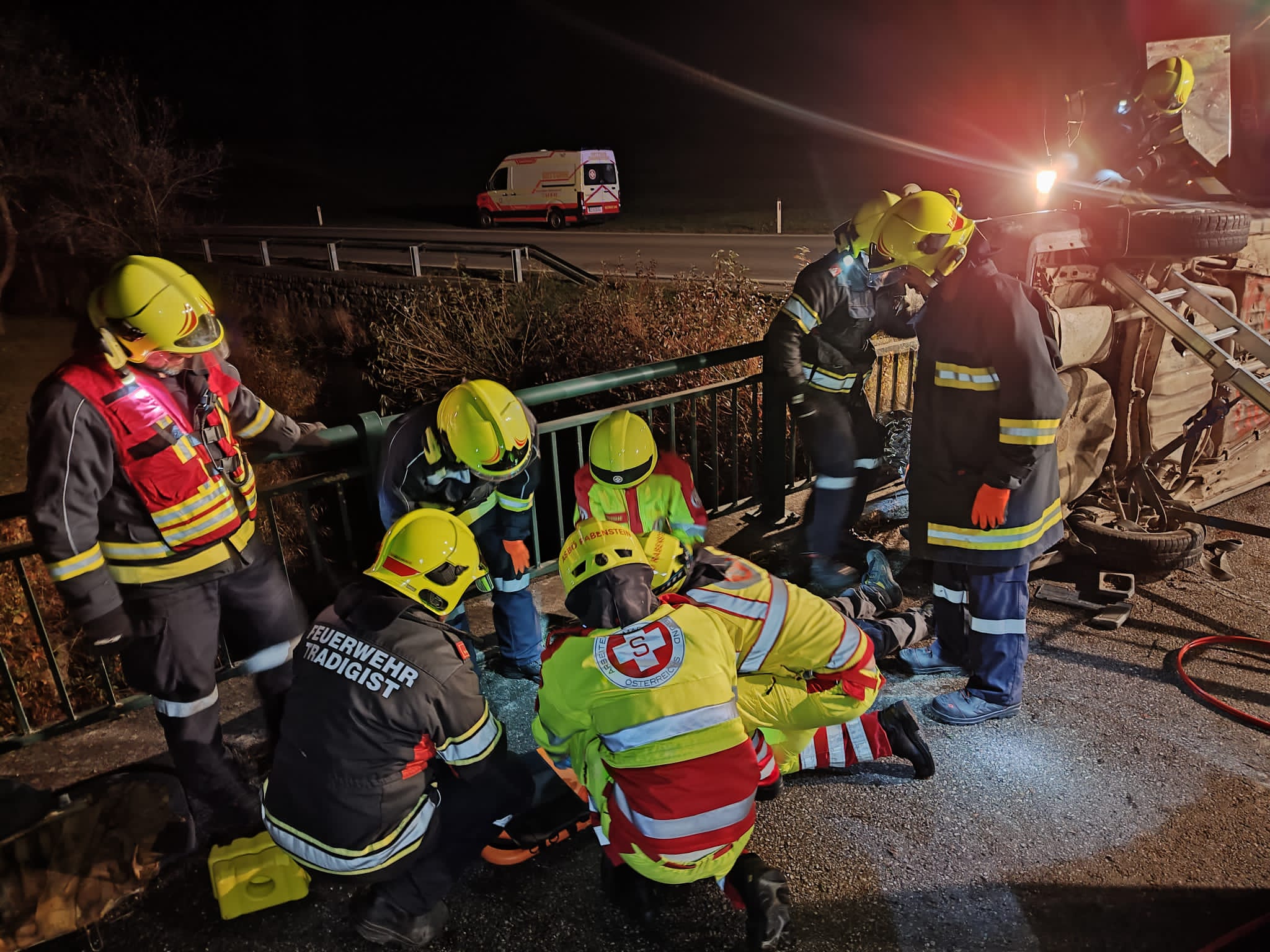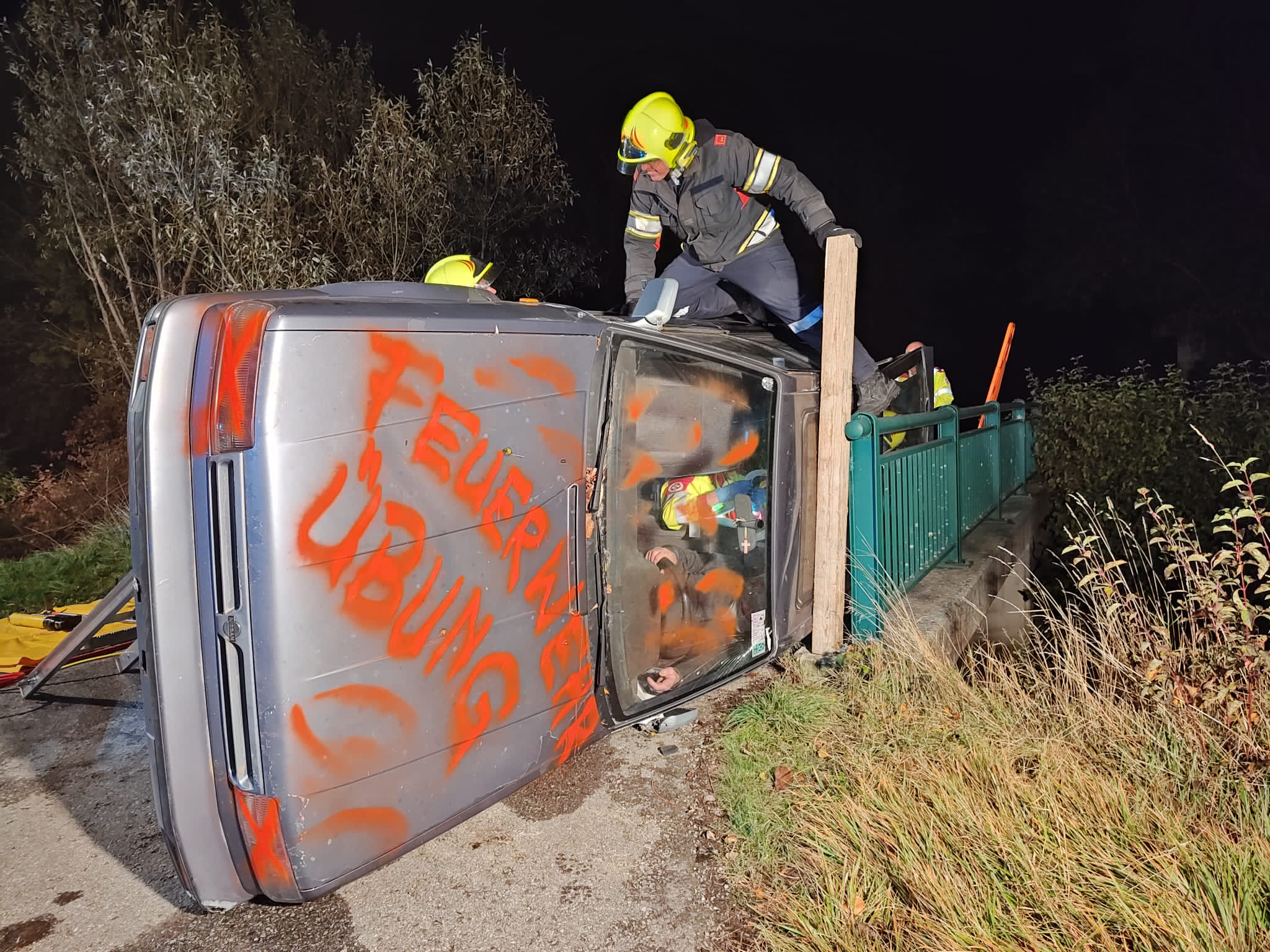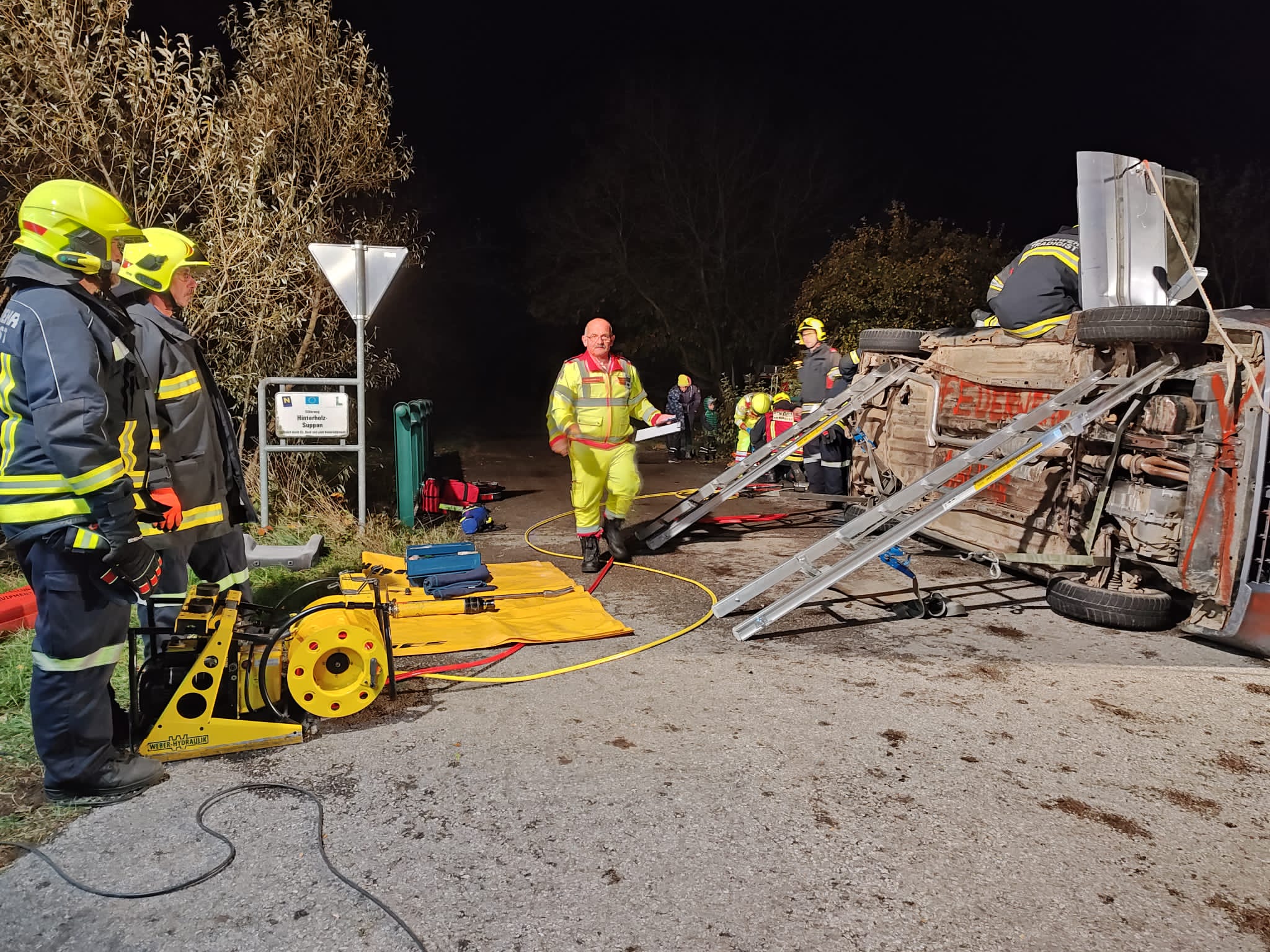 Das Fahrzeug musste als Erstes mittels Steckleitern stabilisiert werden, um ein Umkippen zu verhindern. Weiters wurde mittels hydraulischem Rettungsgerät sowohl über den Kofferraum als auch über die Beifahrerseite ein Zugang zum Patienten geschaffen. Gemeinsam mit den Rettungskräften des ASBÖ wurde die verletze Person mittels Spineboard über den Kofferraum aus dem Auto gerettet.