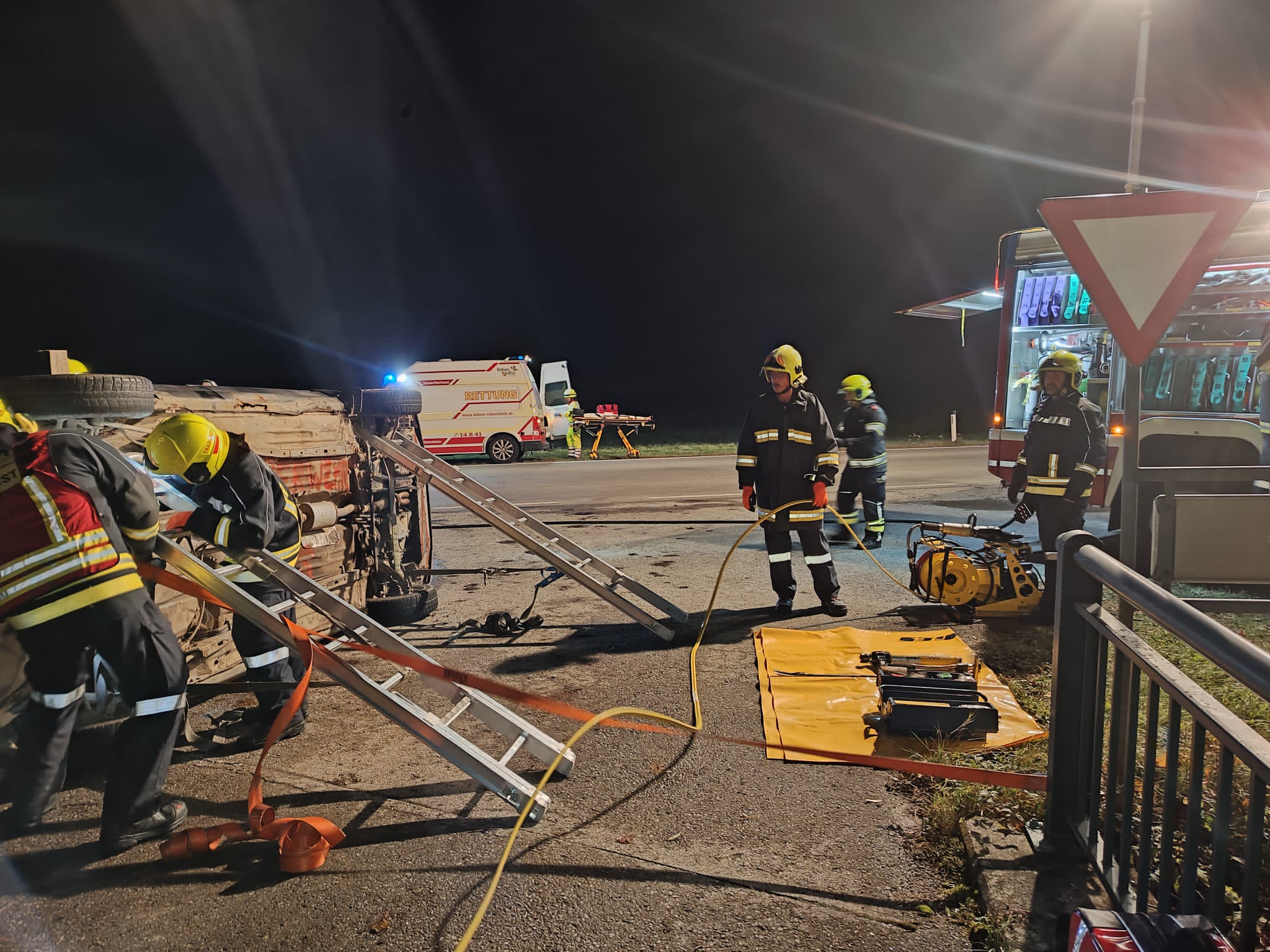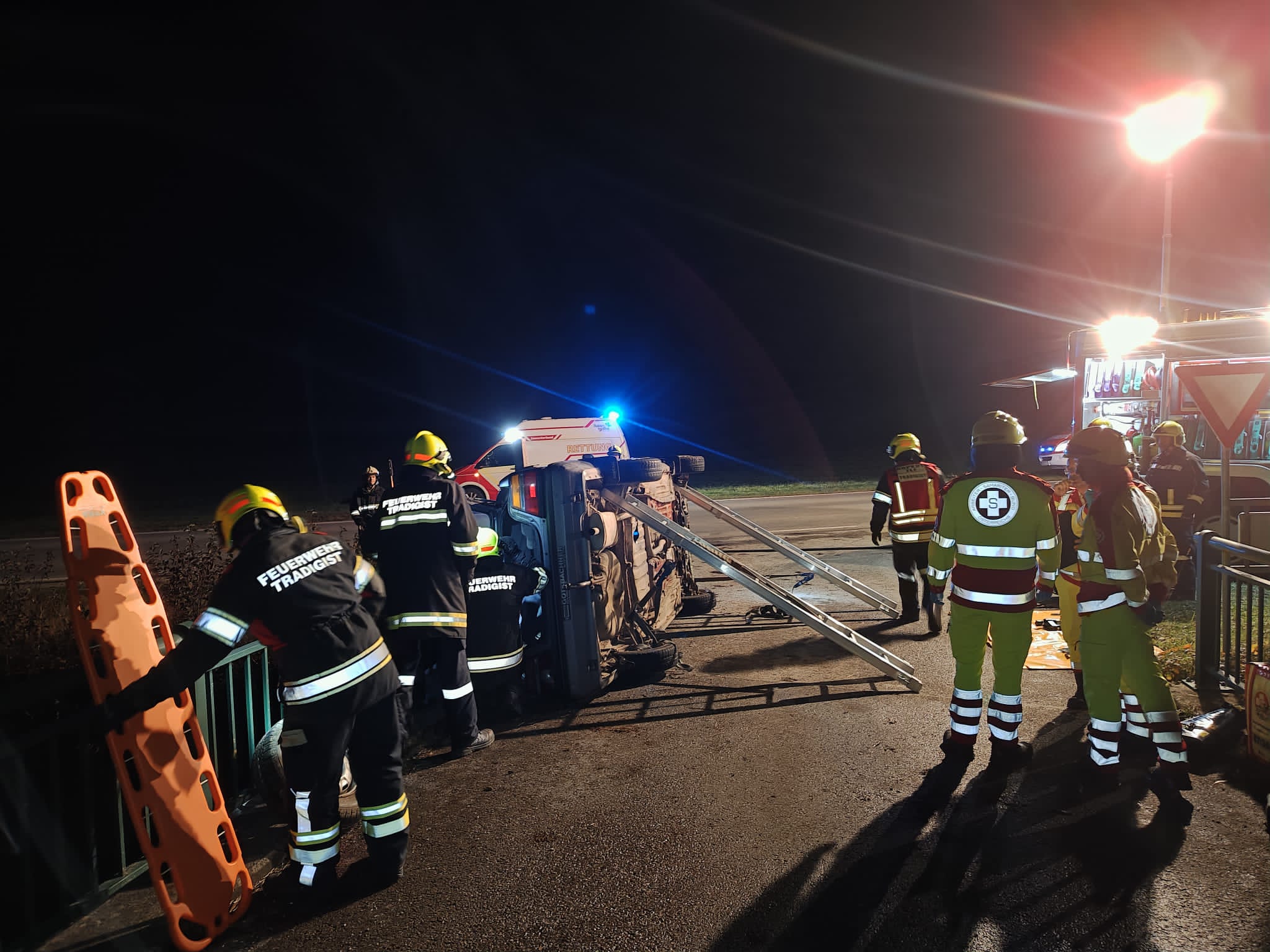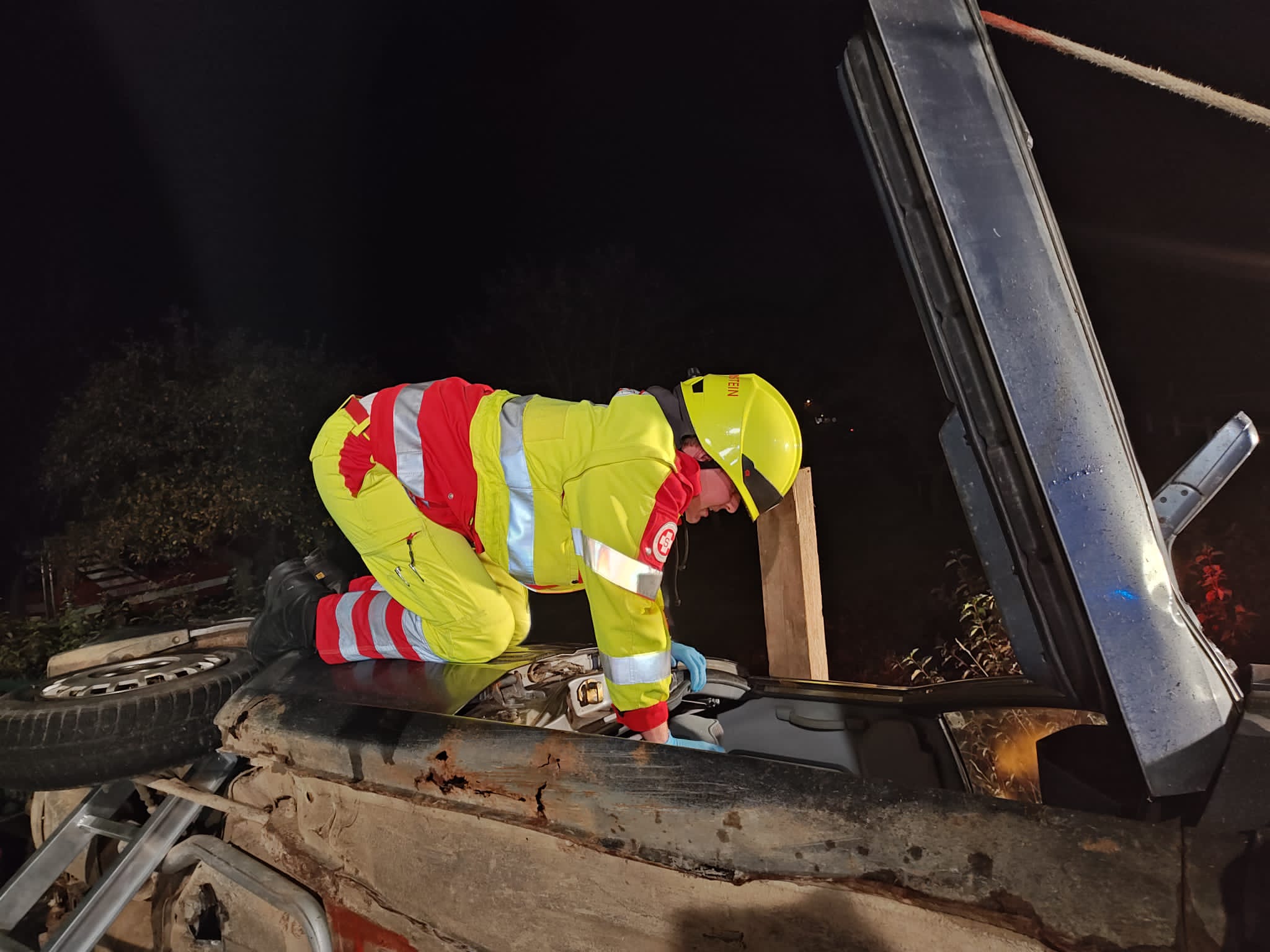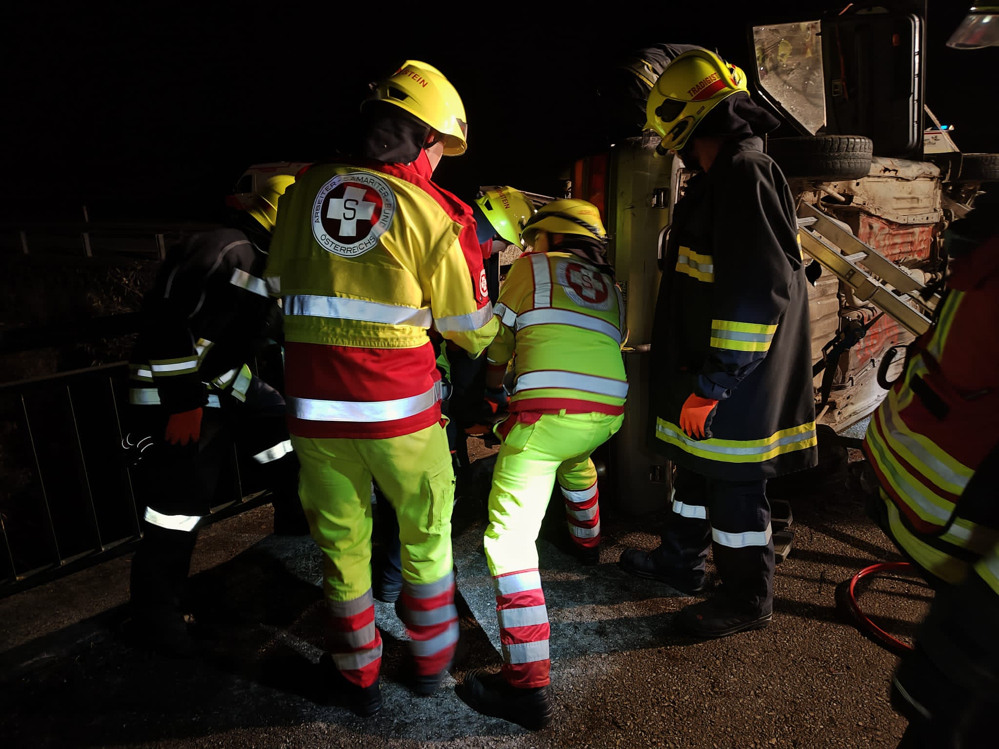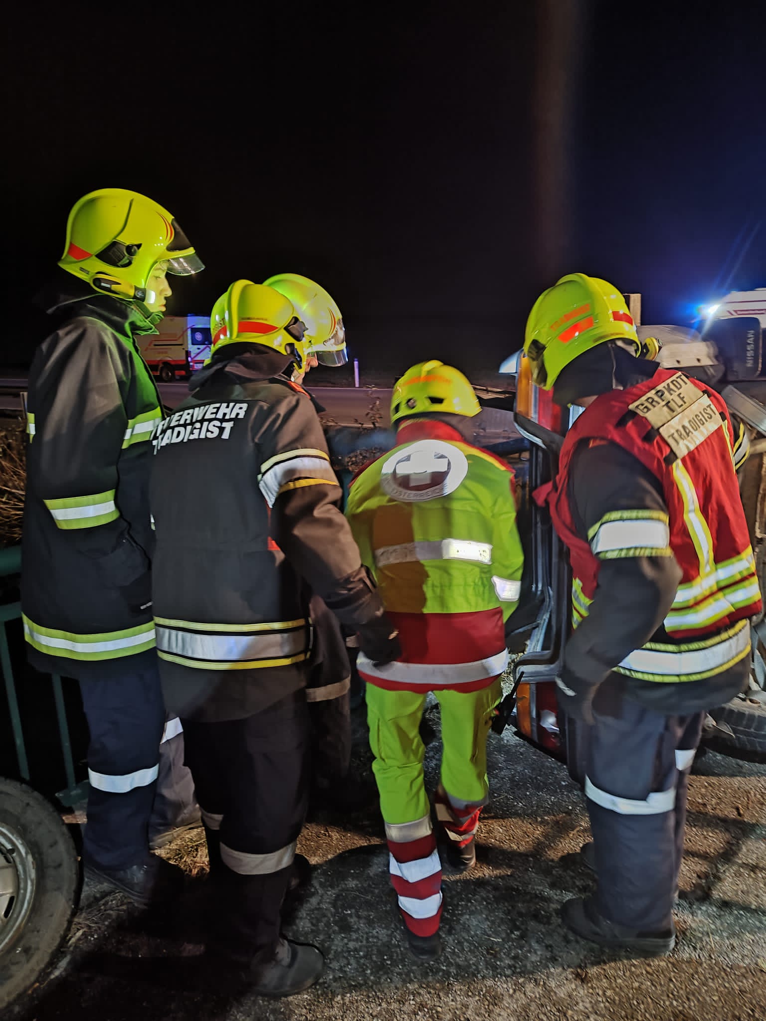 Das Fahrzeug musste als Erstes mittels Steckleitern stabilisiert werden, um ein Umkippen zu verhindern. Weiters wurde mittels hydraulischem Rettungsgerät sowohl über den Kofferraum als auch über die Beifahrerseite ein Zugang zum Patienten geschaffen. Gemeinsam mit den Rettungskräften des ASBÖ wurde die verletze Person mittels Spineboard über den Kofferraum aus dem Auto gerettet.
