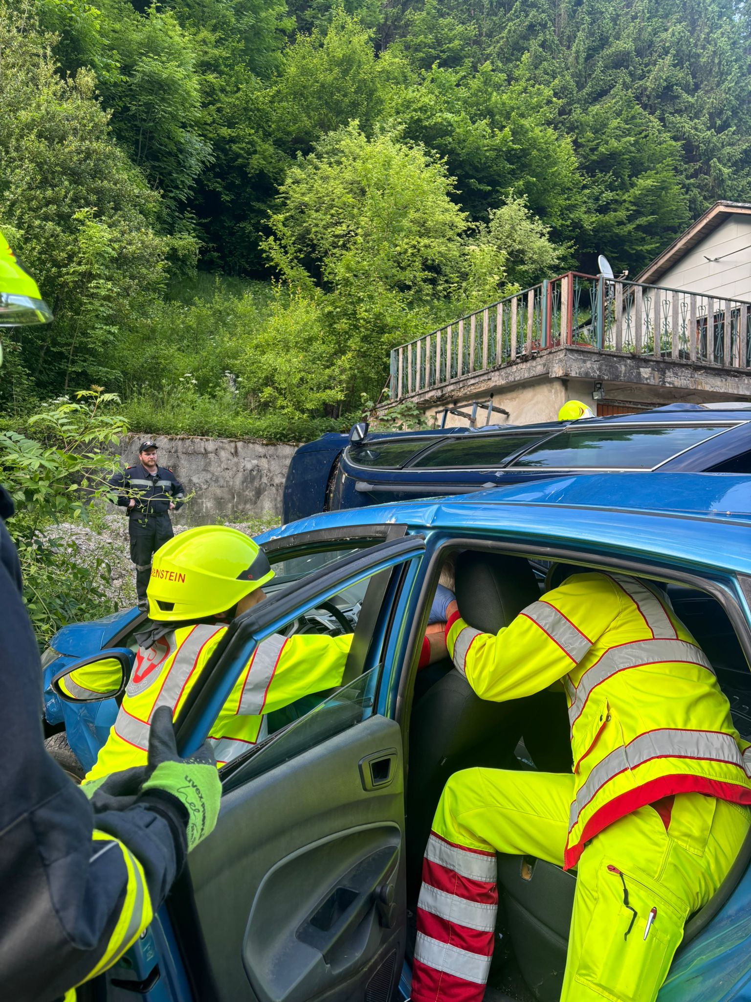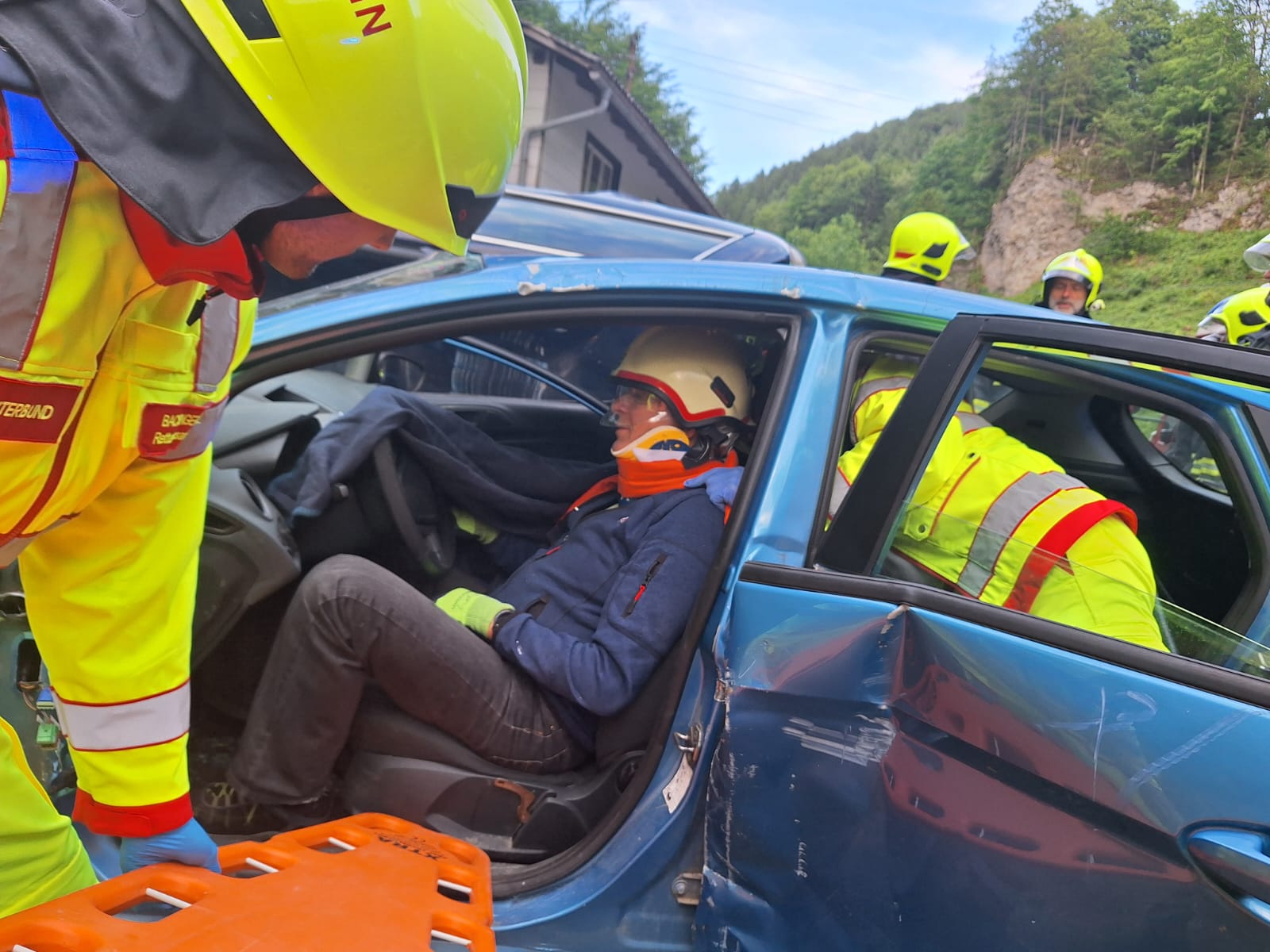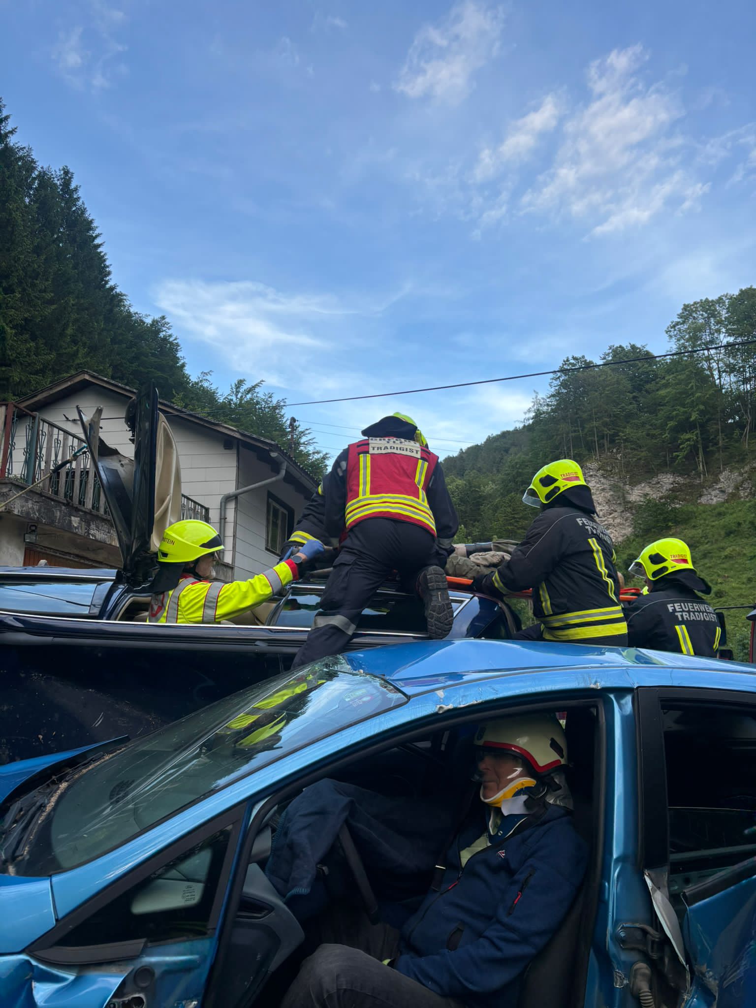 Nach dem Eintreffen am Übungsort stellte sich heraus, dass sich in beiden beteiligten PKWs je eine eingeklemmte Person befand. Das vorrangige Ziel war die rasche und schonende Rettung der verletzten Personen aus den Fahrzeugen.