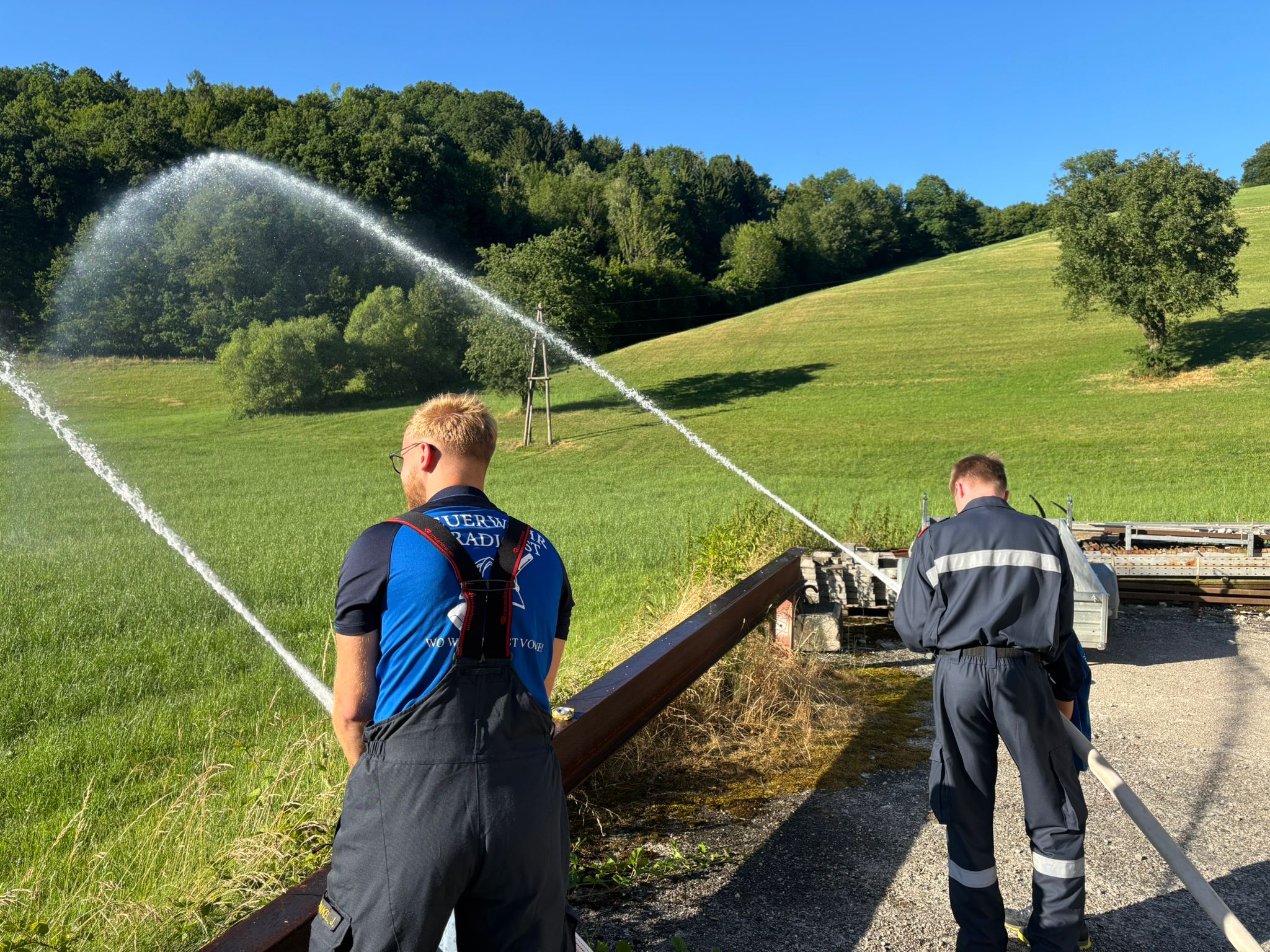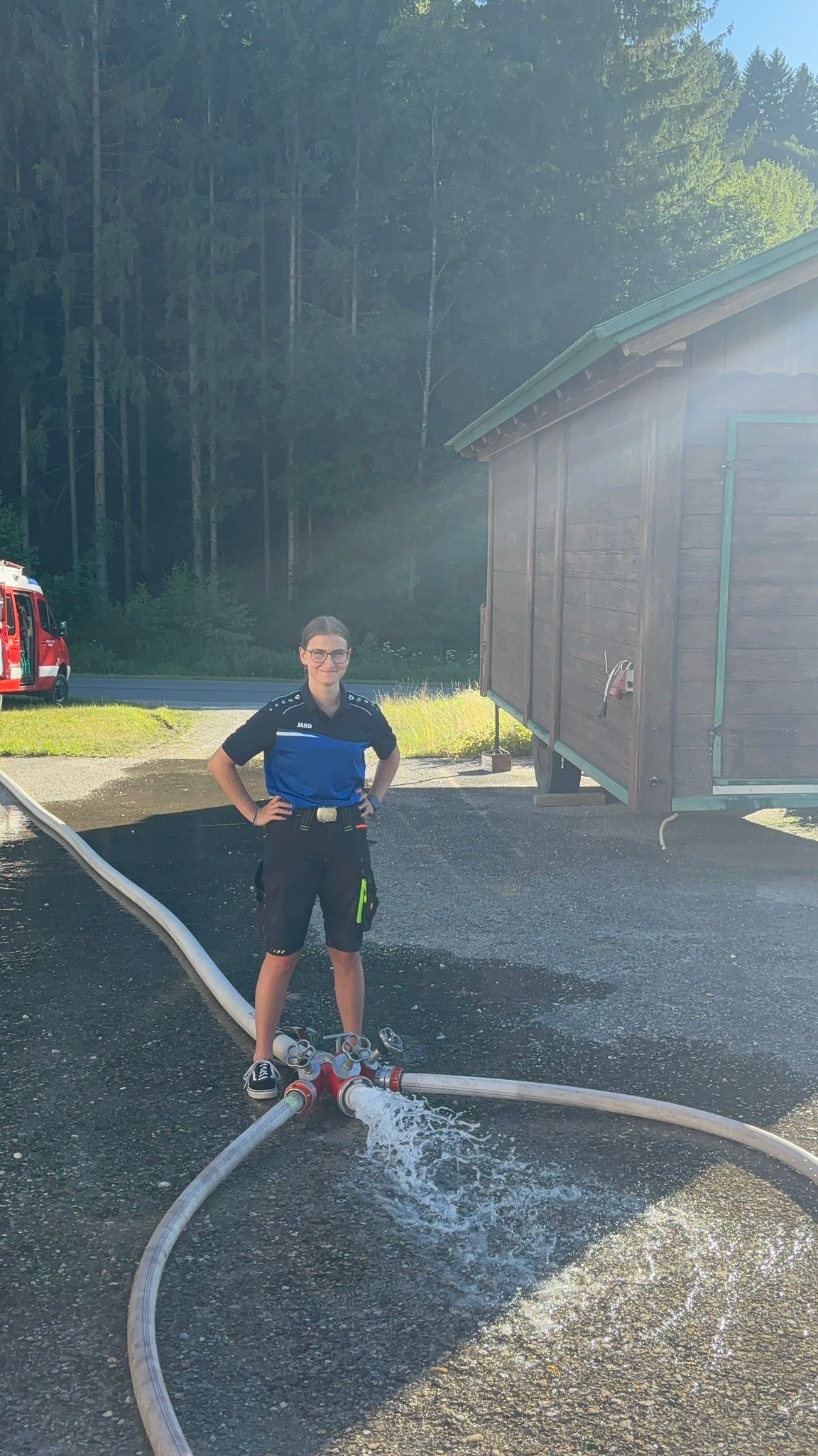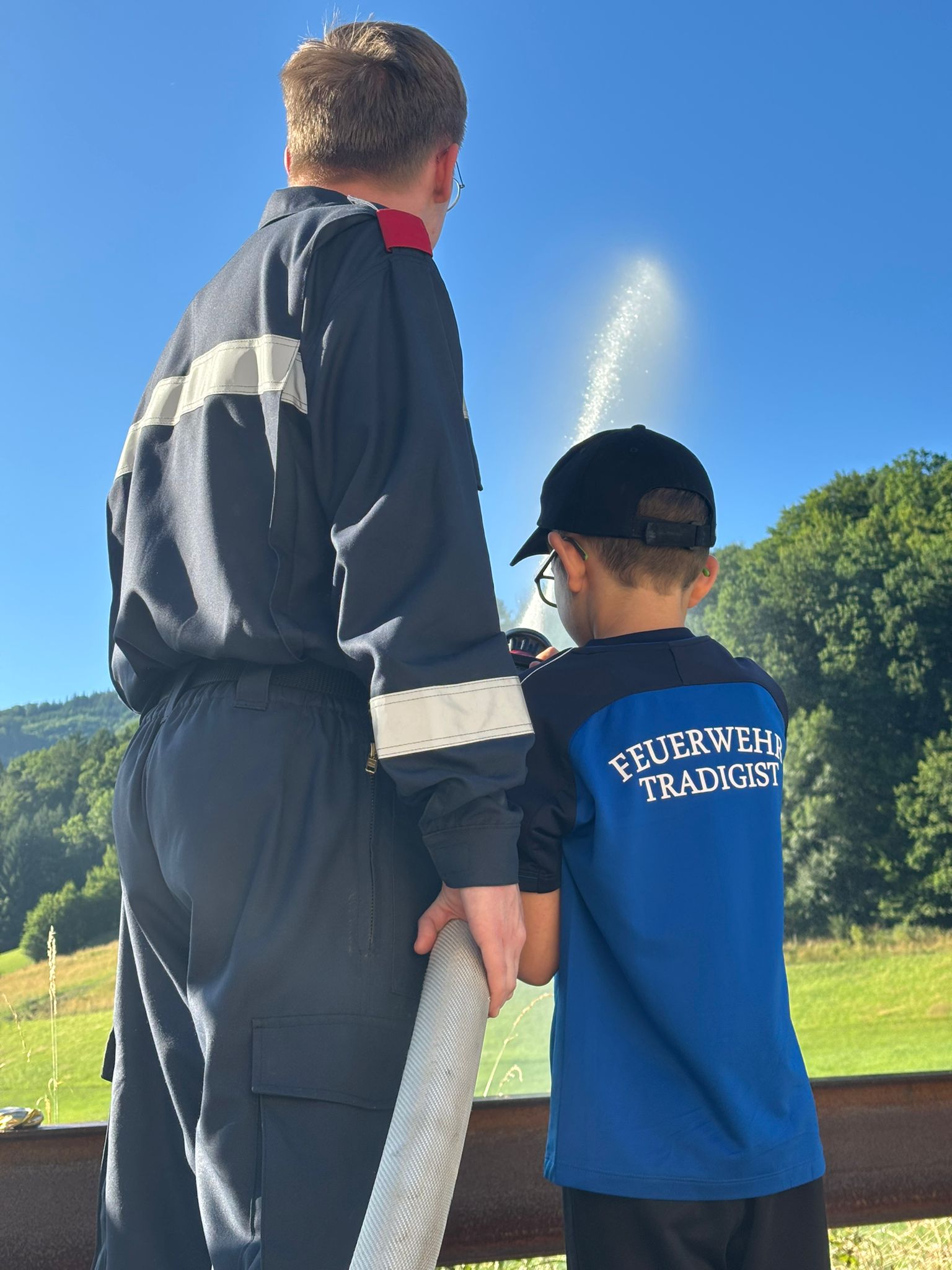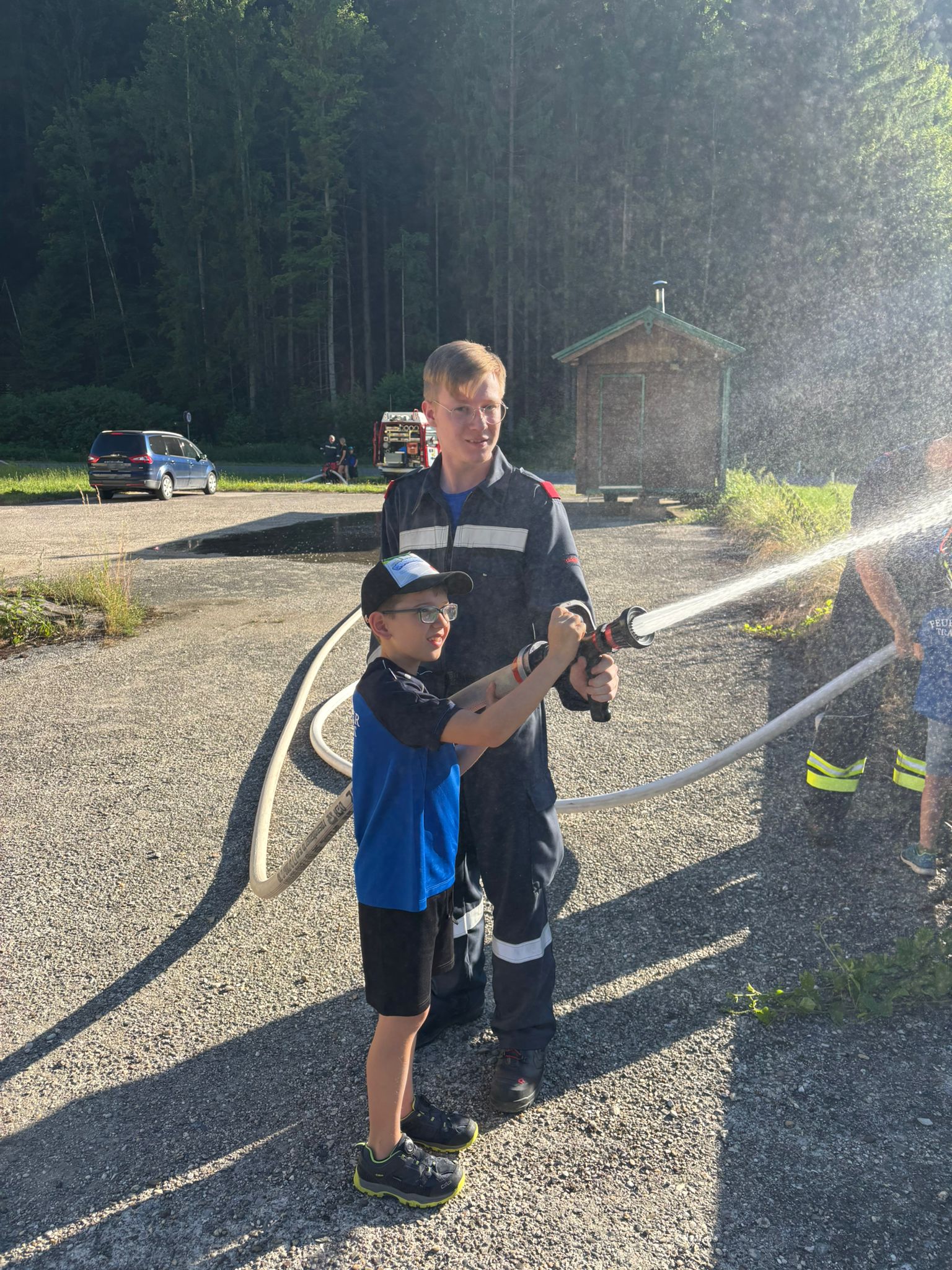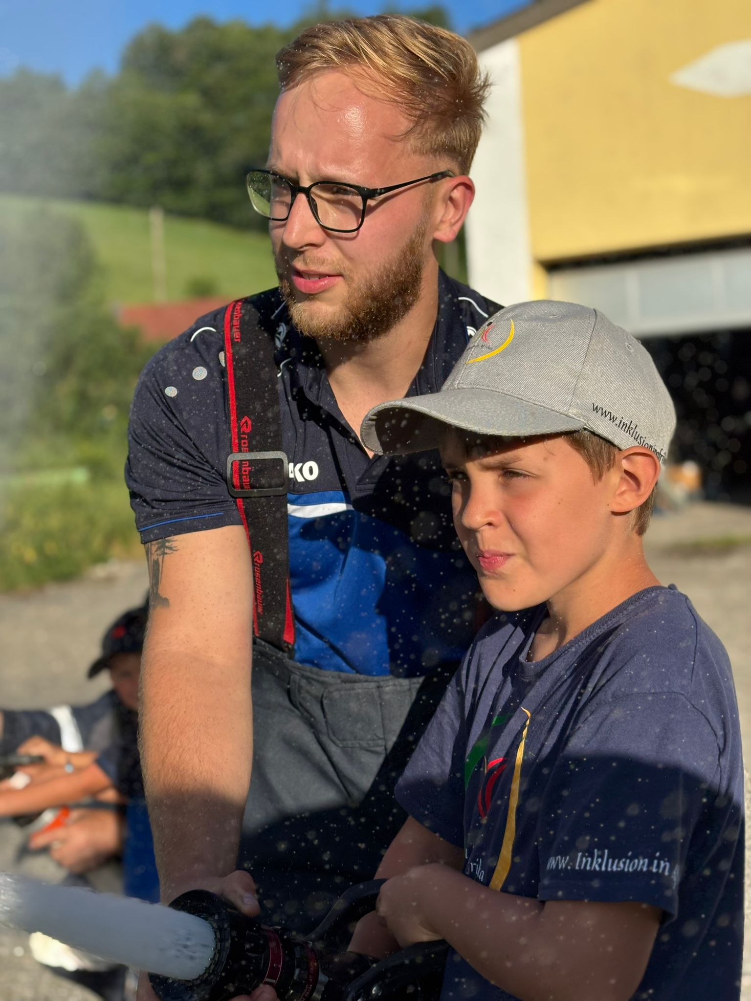 Zum Abschluss versammelten wir uns im Feuerwehrhaus. Dort stellten wir das Hydroschild auf, welches für große Begeisterung sorgte – die Kinder konnten sich damit ordentlich abkühlen und hatten sichtlich Spaß dabei.